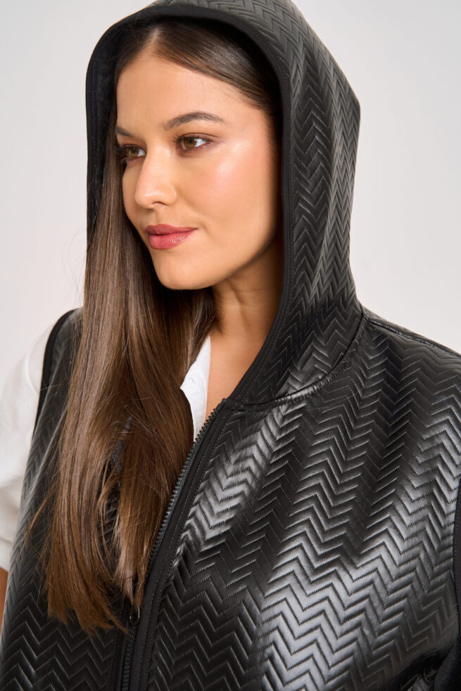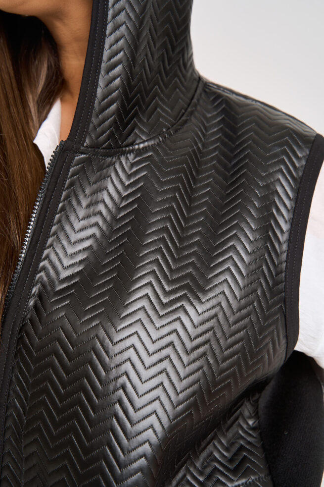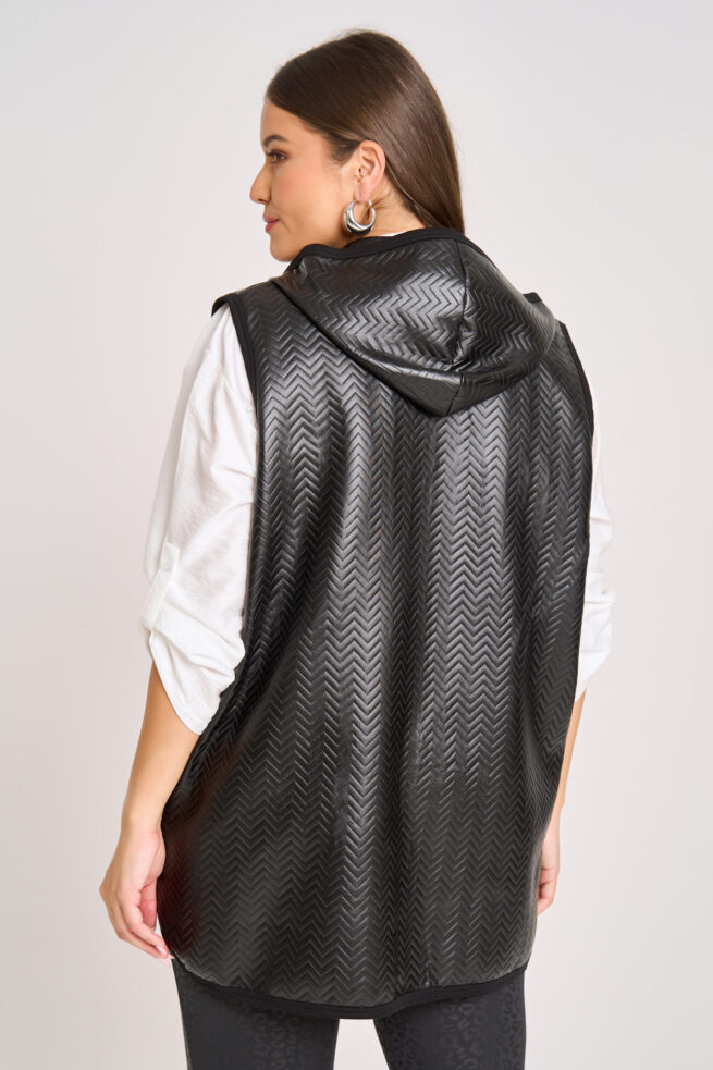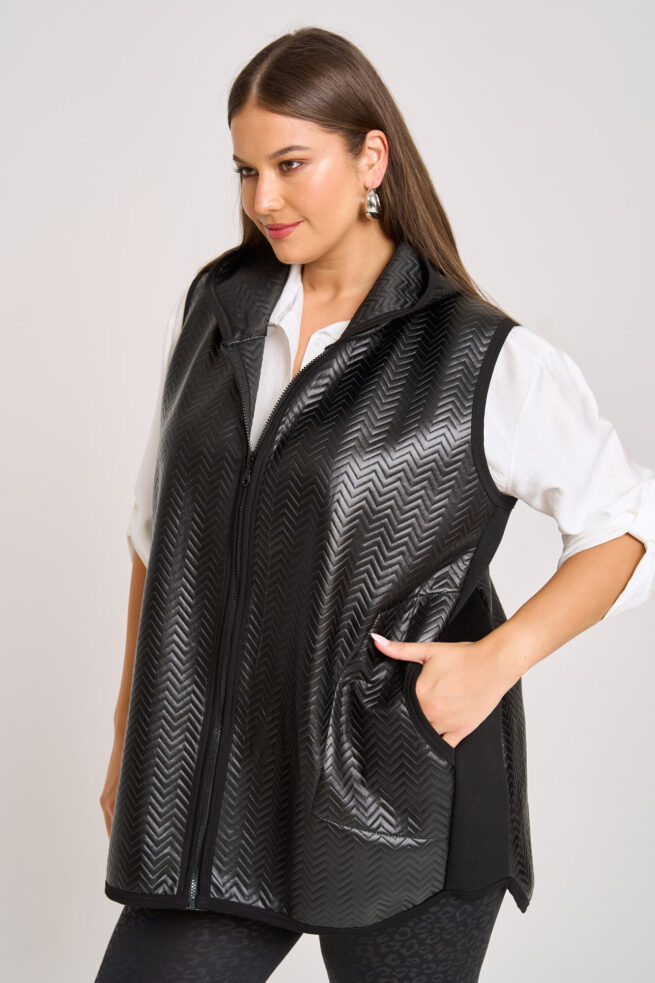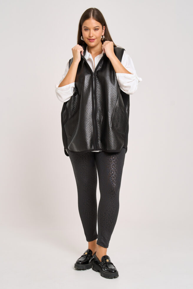 Αμάνικο γιλέκο σε μαύρο χρώμα. Κλείνει με φερμουάρ. Με τσέπες και τσόχα στα πλαϊνά για να προσφέρει μεγαλύτερη ελαστικότητα και να προσαρμόζεται σε διάφορα μεγέθη. Ιδανική επιλογή για τις ενδιάμεσες εποχές. Η Ιβάνα έχει ύψος 180εκ, στήθος 114εκ ,μέση 88εκ και περιφέρεια 121εκ και φοράει το xl.
