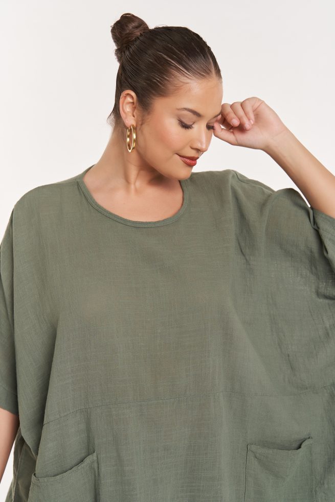 Αέρινη βαμβακερή μπλούζα σε άνετη γραμμή. Στρόγγυλη λαιμόκοψη. Μανίκια στον αγκώνα. Εξωτερικές τσέπες στο ίδιο ύφασμα. Είναι one size και καλύπτει έως 190εκ στήθος και περιφέρεια. Μήκος 86εκ. Δοκιμάστε την με ζώνη ώστε να τονίσετε την μέση σας. Η Ιβάνα έχει ύψος 180εκ, στήθος 114εκ ,μέση 88εκ και περιφέρεια 121εκ.