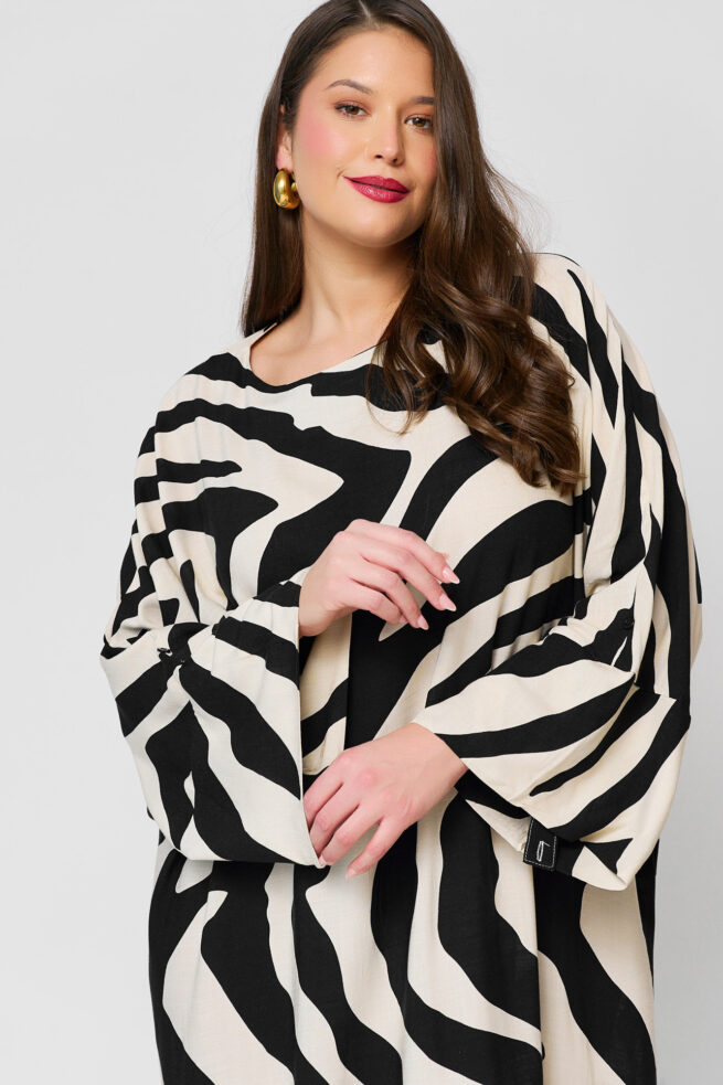 Μακρύ Φόρεμα σε φαρδιά γραμμή με zebra print. Στρογγυλή λαιμόκοψη. Μακριά φαρδιά μανίκια με δυνατότητα αναδίπλωσης και κουμπί για σταθεροποίηση. One size έως 180εκ. στήθος και 180εκ. περιφέρεια. Μήκος 142 εκ. Η Ιβάνα έχει ύψος 180εκ, στήθος 114εκ ,μέση 88εκ και περιφέρεια 121εκ.