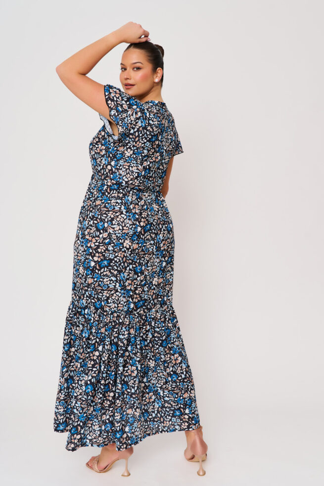 Maxi φόρεμα με βολάν στο τελείωμα. Ύφασμα σε φλοράλ μοτίβο και μπλε αποχρώσεις. V λαιμόκοψη. Κοντά αέρινα μανίκια. Ένα κομμάτι που ξεχωρίζει για το στιλ και την άνεσή του. Η Ιβάνα έχει ύψος 180εκ, στήθος 114εκ ,μέση 88εκ και περιφέρεια 121εκ. και φοράει 2xl.