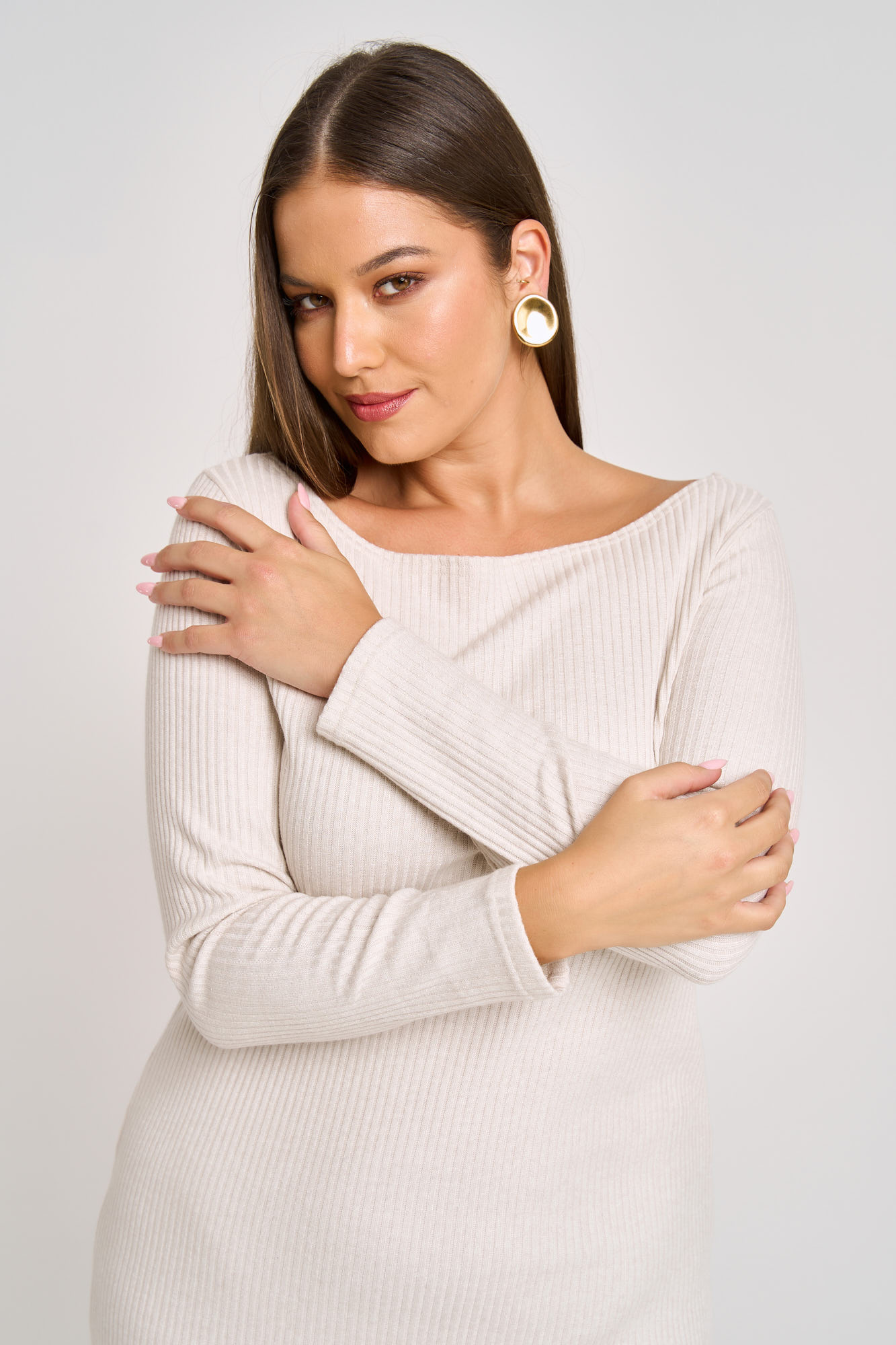 Φόρεμα Μάξι pencil σε πλεκτό ύφασμα. Ριγέ μοτίβο σε κρεμ και πράσινο. Μακριά μανίκια. Λαιμόκοψη χαμόγελο. Αγκαλιάζει το σώμα και αναδεικνύει τη σιλουέτα. Πρόκειται για ένα ρούχο που συνδυάζει θηλυκότητα και στυλ, κατάλληλο για cozy εμφανίσεις. Η Ιβάνα έχει ύψος 180εκ, στήθος 114εκ ,μέση 88εκ και περιφέρεια 121εκ και φοράει xl.