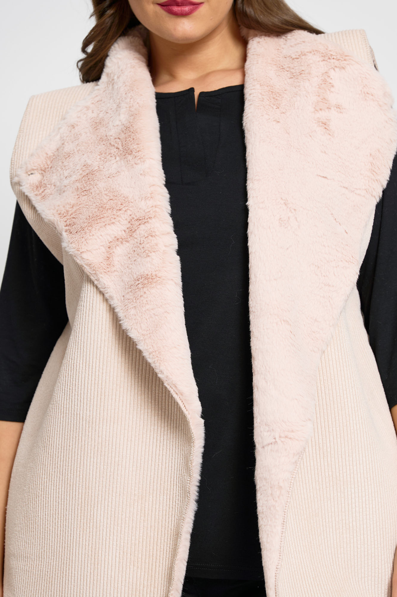Γυναικείο premium jacket plus size διπλής όψης, με γουνάκι και κοτλέ ύφασμα. Ιδανικό για στιλάτες χειμερινές εμφανίσεις, αυτό το μπουφάν σου προσφέρει δύο μοναδικές επιλογές: η μία πλευρά διαθέτει απαλό γουνάκι για ζεστή και πολυτελή αίσθηση, ενώ η άλλη πλευρά έχει κοτλέ υφή για casual chic look. Κουμπώνει και από τις δύο πλευρές με διακριτικά κουμπιά, ενώ μπορεί να φορεθεί και ανοιχτό για πιο χαλαρή εμφάνιση. Ένα κομψό και πρακτικό πανωφόρι, τέλειο για τις κρύες ημέρες, που συνδυάζει άνεση, στυλ και ευελιξία. Κουμπωμένο καλύπτει στήθος έως 130εκ και περιφέρεια έως 140εκ. Μήκος 85εκ. Η Ιβάνα έχει ύψος 180εκ, στήθος 114εκ ,μέση 88εκ και περιφέρεια 121εκ.