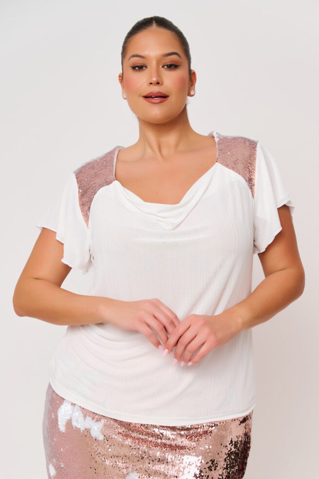 Κομψή ελαστική μπλούζα με ιδιαίτερο ύφασμα. Κοντά αέρινα μανίκια. Ωμύτες σε παγιέτα διπλής όψεως σε ροζ χρυσό και λευκό χρώμα. Ντραπέ λαιμόκοψη. Συνδυάστε την με την φούστα Diva για μία εντυπωσιακή total look εμφάνιση. Η Ιβάνα έχει ύψος 180εκ, στήθος 114εκ ,μέση 88εκ και περιφέρεια 121εκ και φοράει xl.