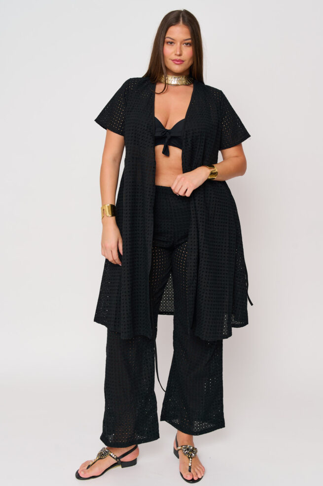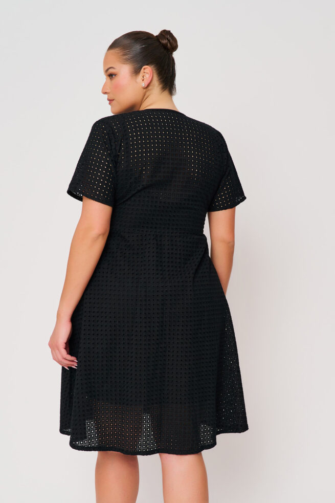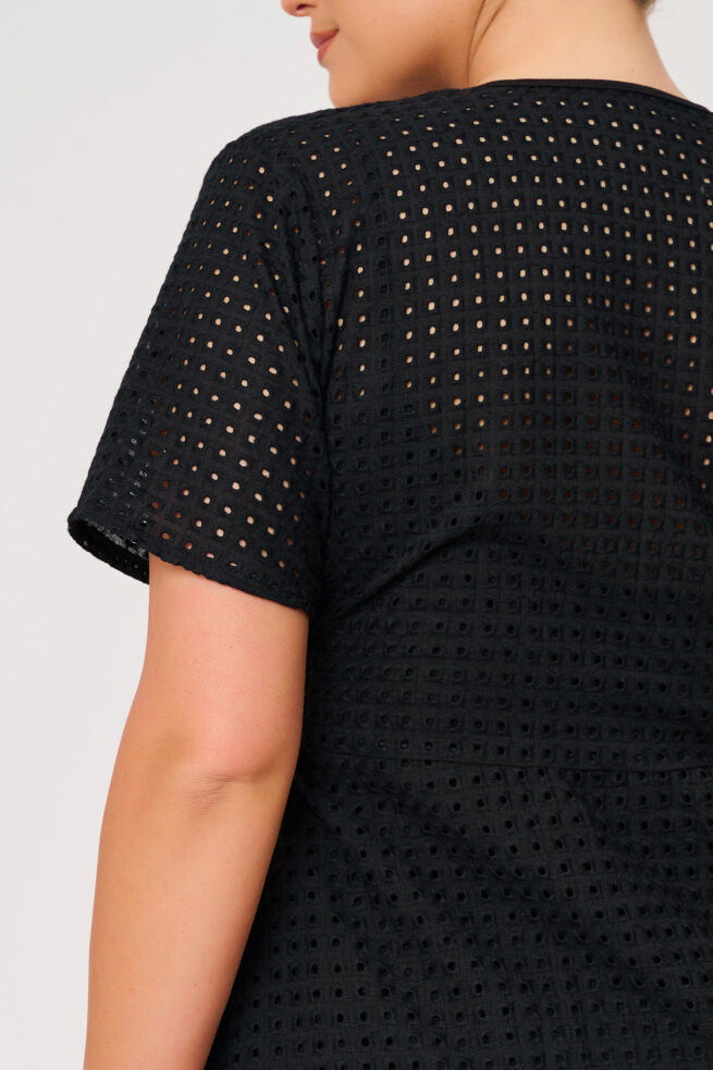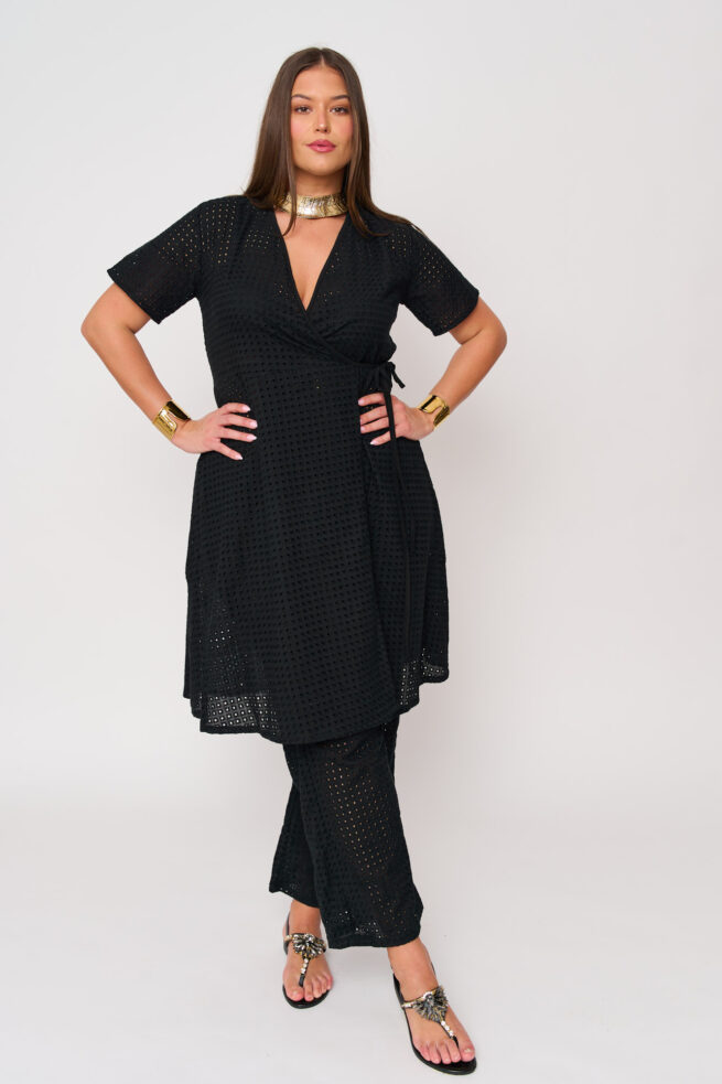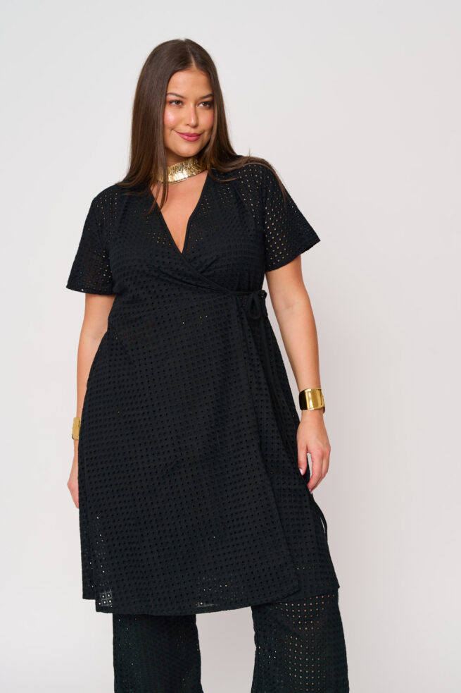 Κρουαζέ Φόρεμα με Δαντέλα Κιπούρ σε μαυρό χρώμα. A γραμμή. V λαιμόκοψη και κοντά μανίκια. Δέσιμο στο πλάι με κορδόνι ίδιου χρώματος. Αποτελείται από αποσπώμενο μαύρο εφαρμοστό μεσοφόρι, το οποίο μπορεί να φορεθεί και με άλλα ρούχα σας. Ένα κομμάτι που παραμένει διαχρονικό και μπορείτε να φορέσετε κάθε στιγμή της ημέρας. Συνδυάστε το με την αντίστοιχη παντελόνα για ένα εντυπωσιακό layering look ή φορέστε το μόνο του, ανάλογα με την περίσταση, για ένα κομψό και αέρινο στυλ. Η Ιβάνα έχει ύψος 180εκ, στήθος 114εκ ,μέση 88εκ και περιφέρεια 121εκ και φοράει xl.
