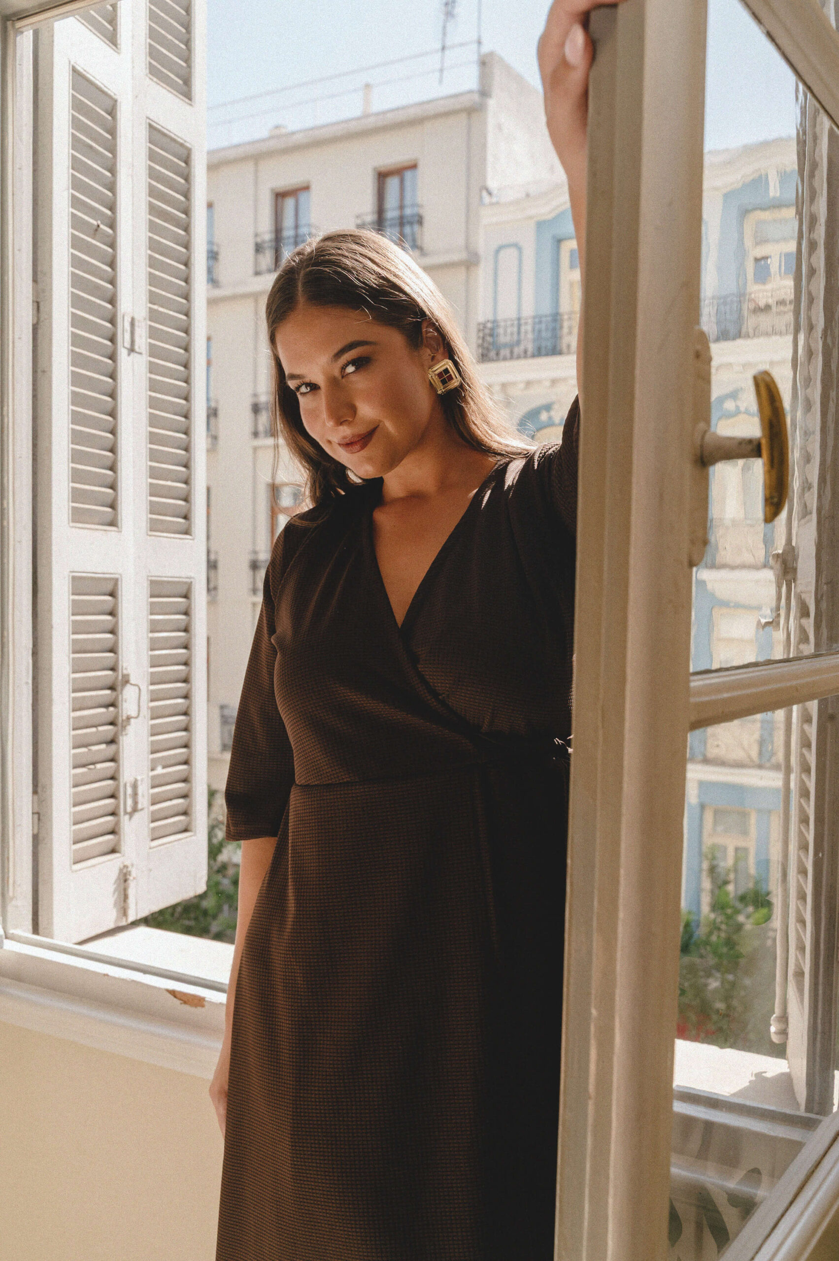 Ανανεώστε τη συλλογή σας με αυτό το κομψό κρουαζέ φόρεμα σε καφέ ψιλό καρό ύφασμα. Η γραμμή του αγκαλιάζει αρμονικά το σώμα, ενώ η ζώνη στη μέση τονίζει τη σιλουέτα με τον πιο θηλυκό τρόπο. Το ελαφρώς ελαστικό ύφασμα εξασφαλίζει άνεση και ευκολία στην κίνηση, ιδανικό για όλες τις ώρες της ημέρας. 3/4 καμπάνα μανίκια. Ιδανικό για plus size γυναίκες που αγαπούν το στυλ και την άνεση. Η Ιβάνα έχει ύψος 180εκ, στήθος 114εκ ,μέση 88εκ και περιφέρεια 121εκ και φοράει xl.