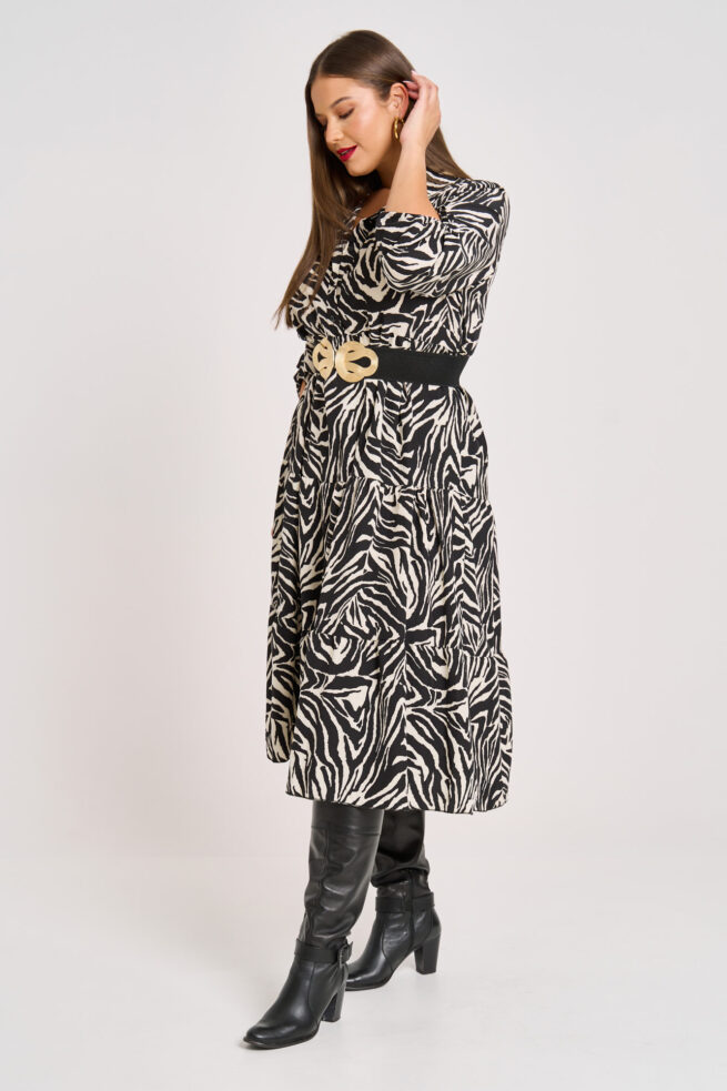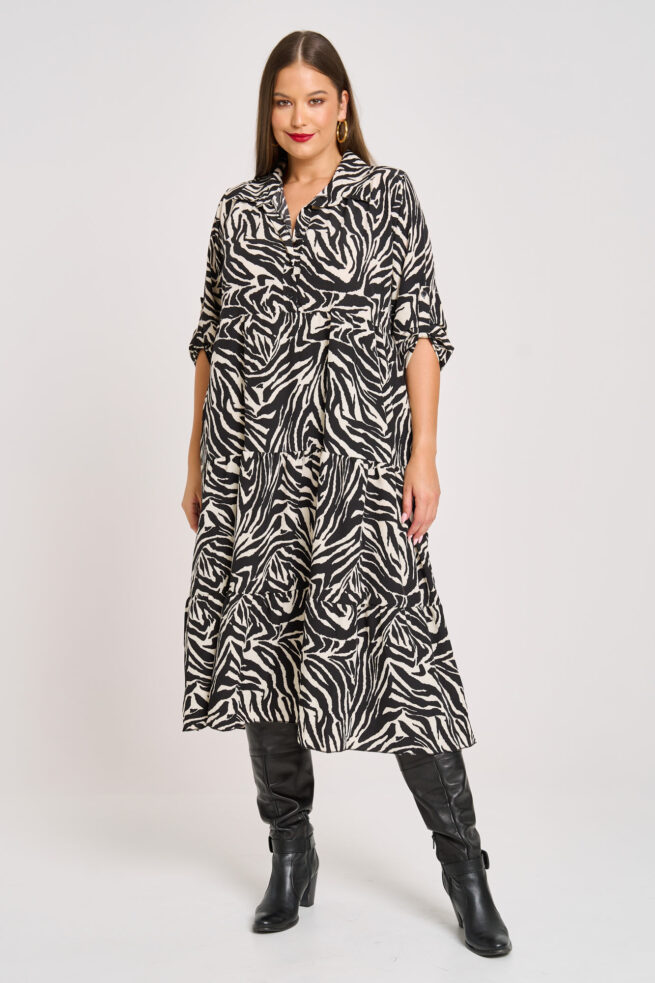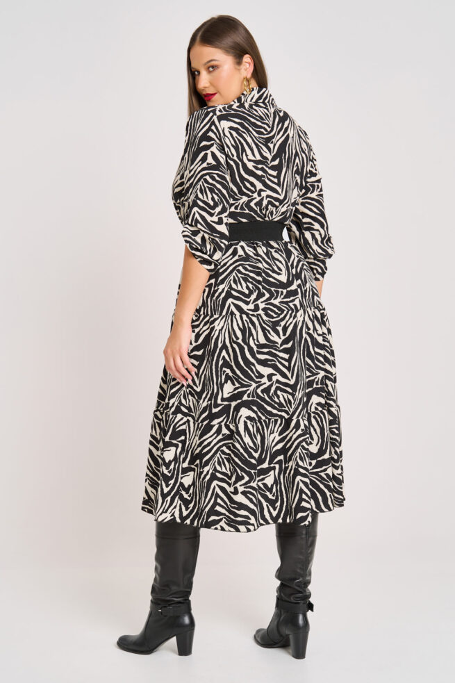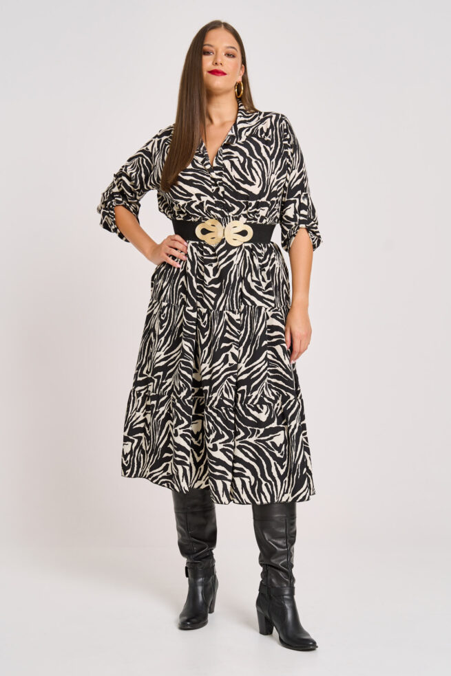 Midi Φόρεμα Animal Print με Γιακά Πουκαμίσου & Βολάν Melina Zebra