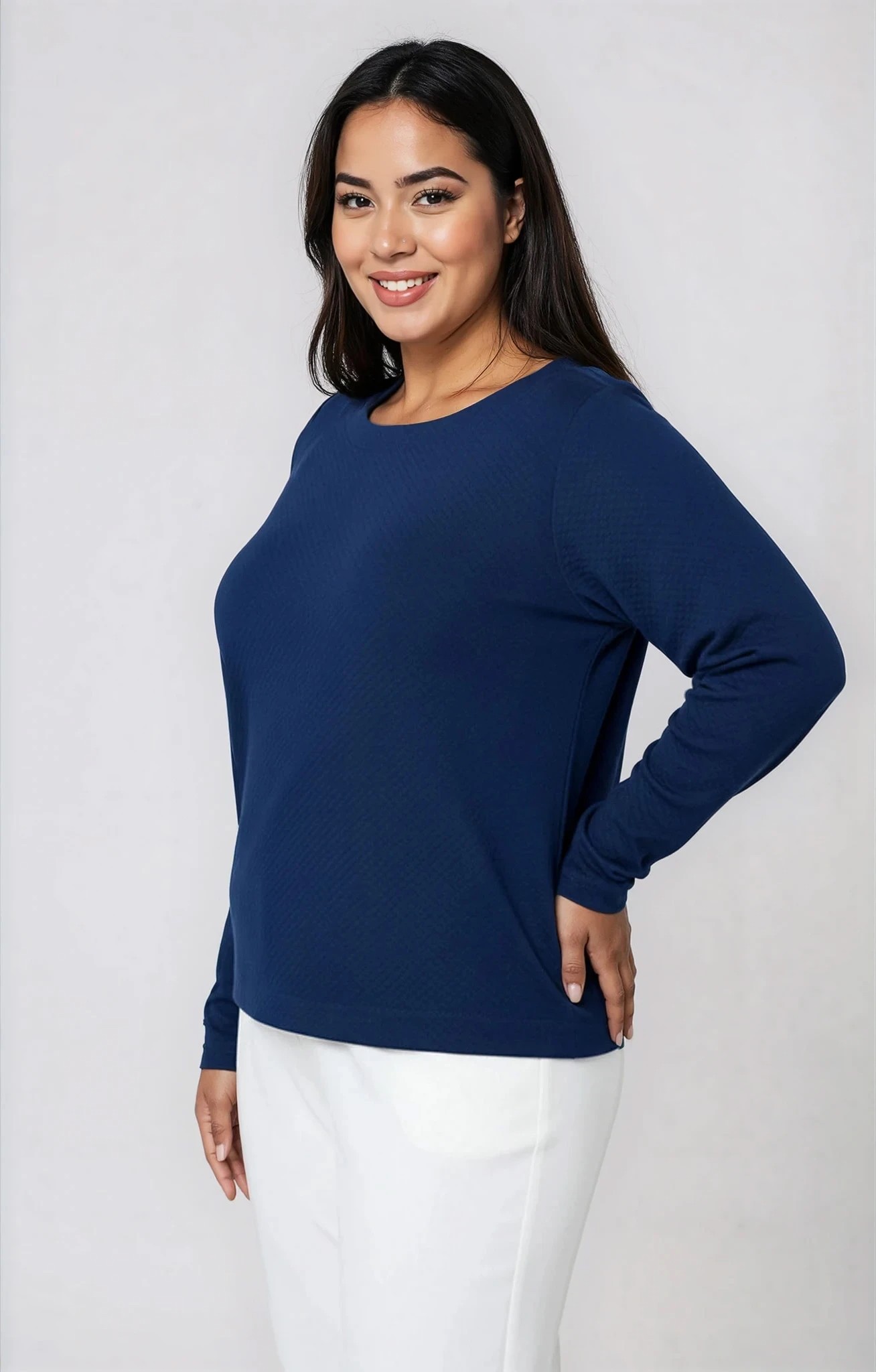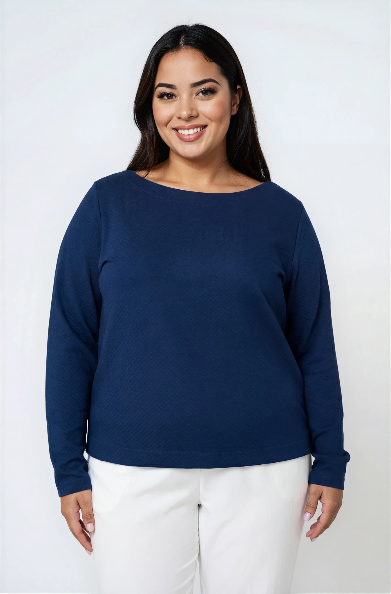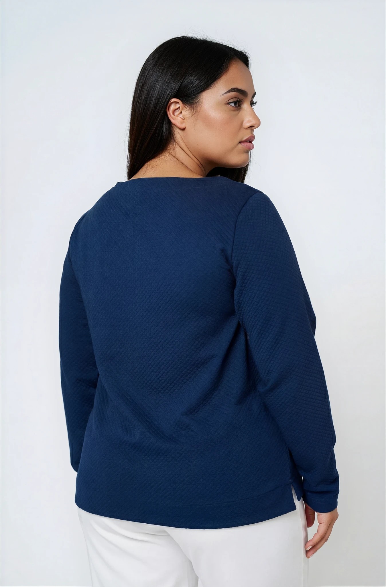 Plus size ελαστική μπλούζα από καπιτονέ ύφασμα, ιδανική για άνετα και προσεγμένα καθημερινά looks. Διαθέτει λαιμόκοψη χαμόγελο και μακριά μανίκια, ενώ η πιο μακριά πλάτη προσφέρει επιπλέον κάλυψη και κομψή εφαρμογή. Τα πλαϊνά ανοίγματα χαρίζουν άνεση στην κίνηση και στιλ, καθιστώντας τη ιδανική επιλογή για all day εμφανίσεις.