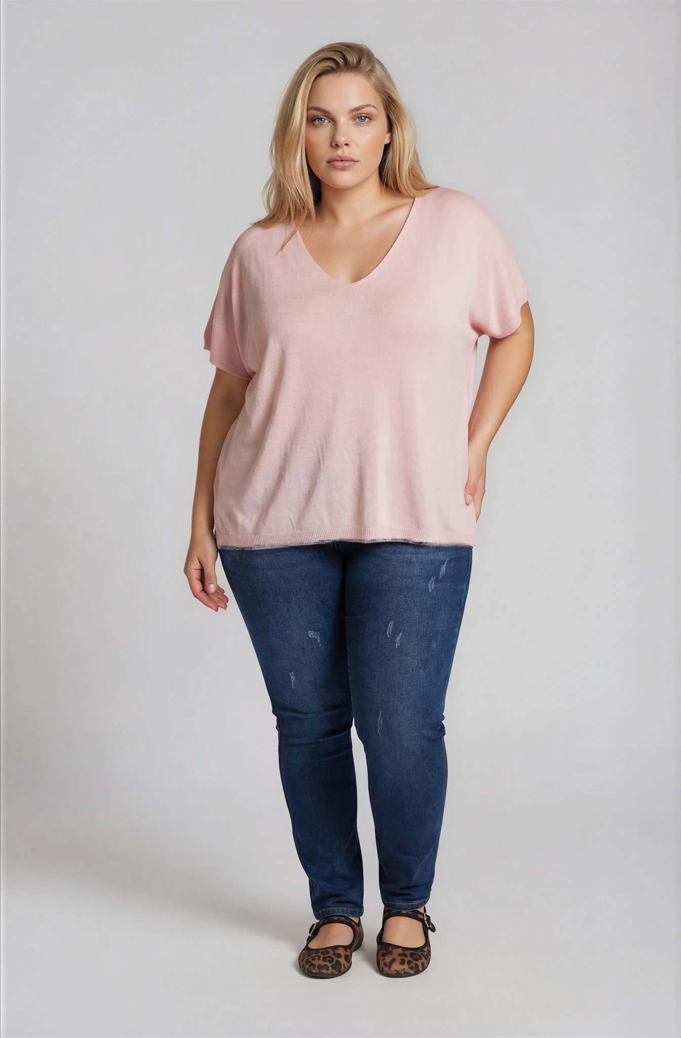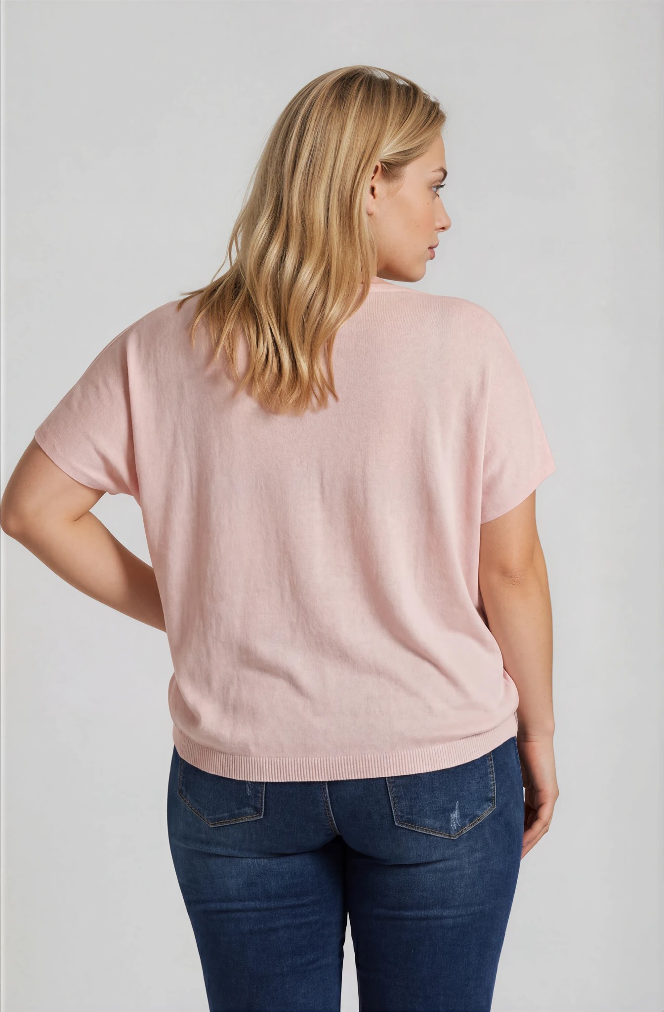 Boxy μπλούζα με θηλυκή V λαιμόκοψη, ιδανική επιλογή για άνετα και στιλάτα looks από το πρωί έως το βράδυ. Το λεπτό πλεκτό ύφασμά της προσφέρει ανάλαφρη αίσθηση και εξαιρετική διαπνοή, καθιστώντας τη ιδανική για την άνοιξη και το καλοκαίρι.