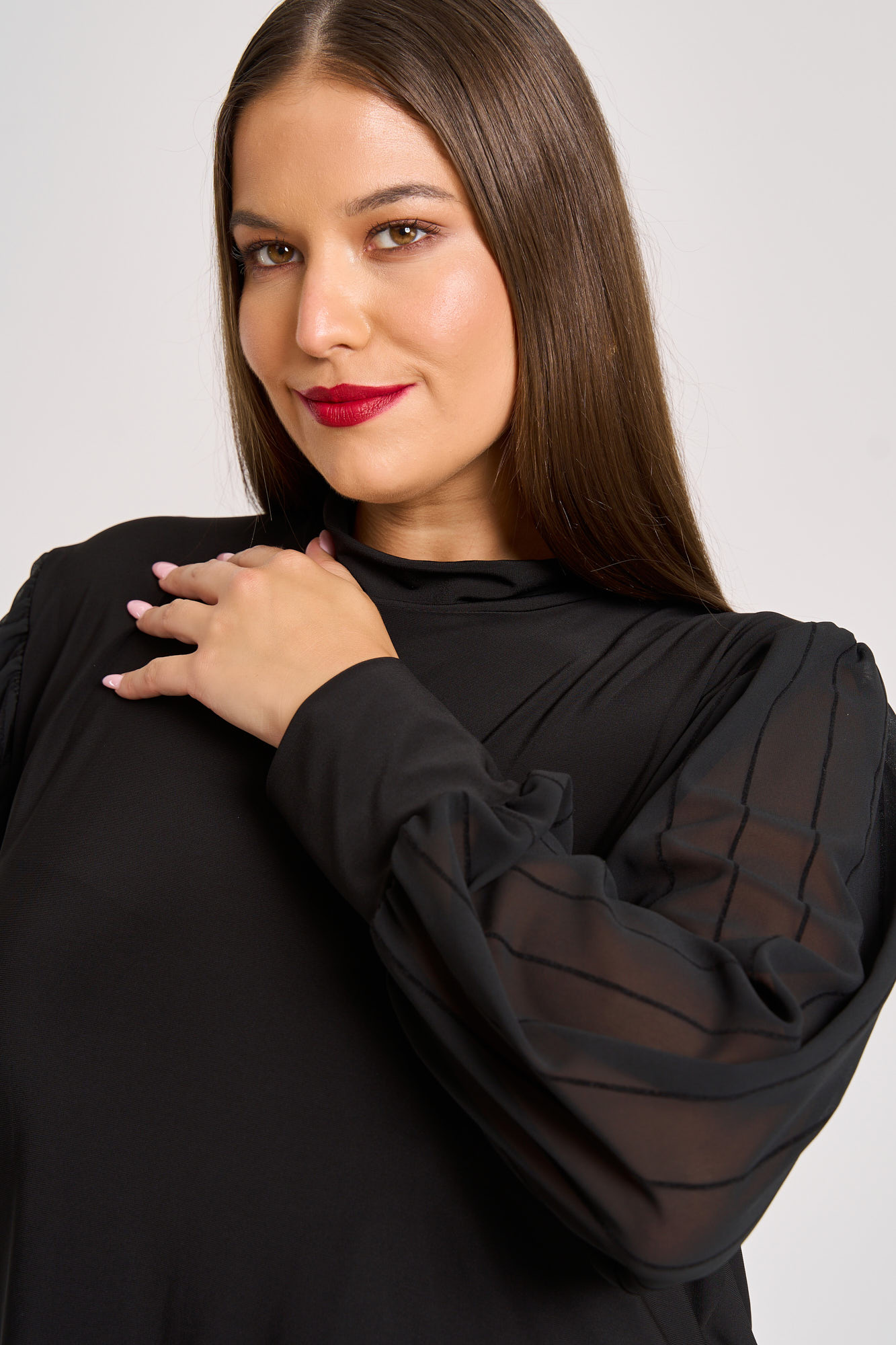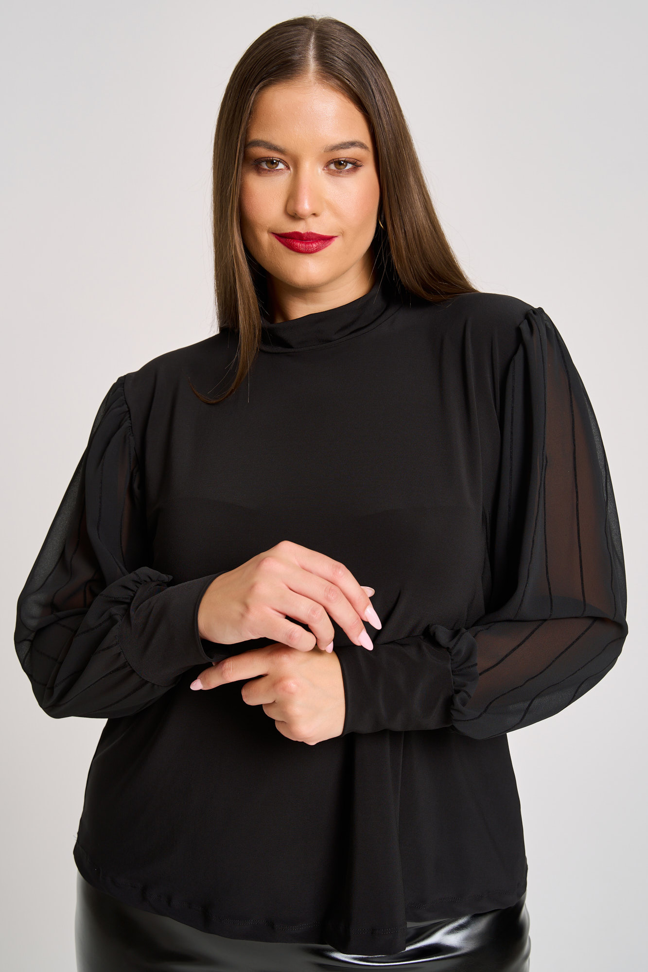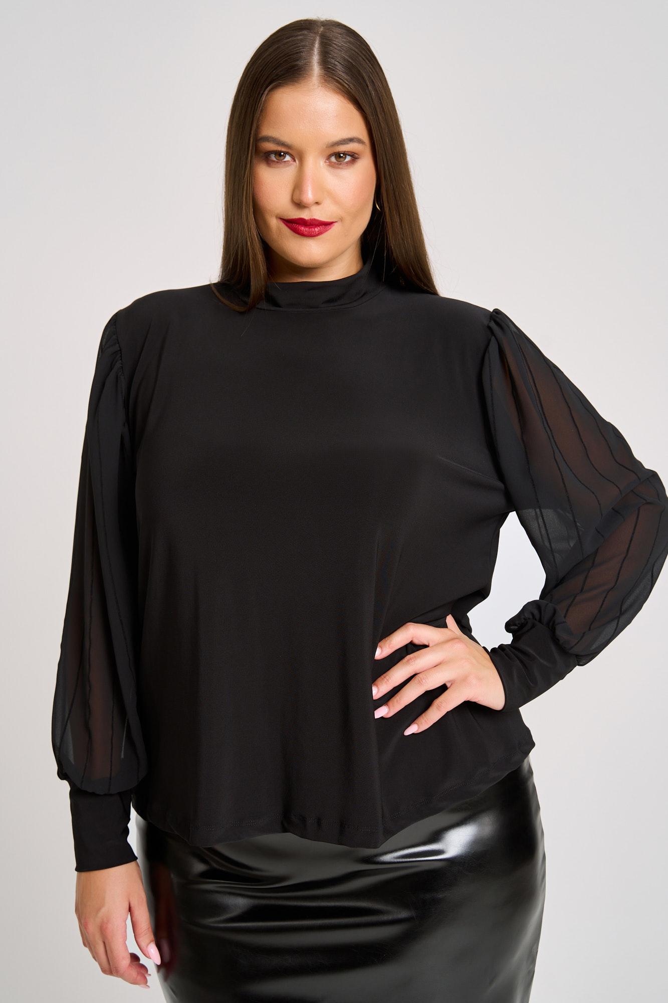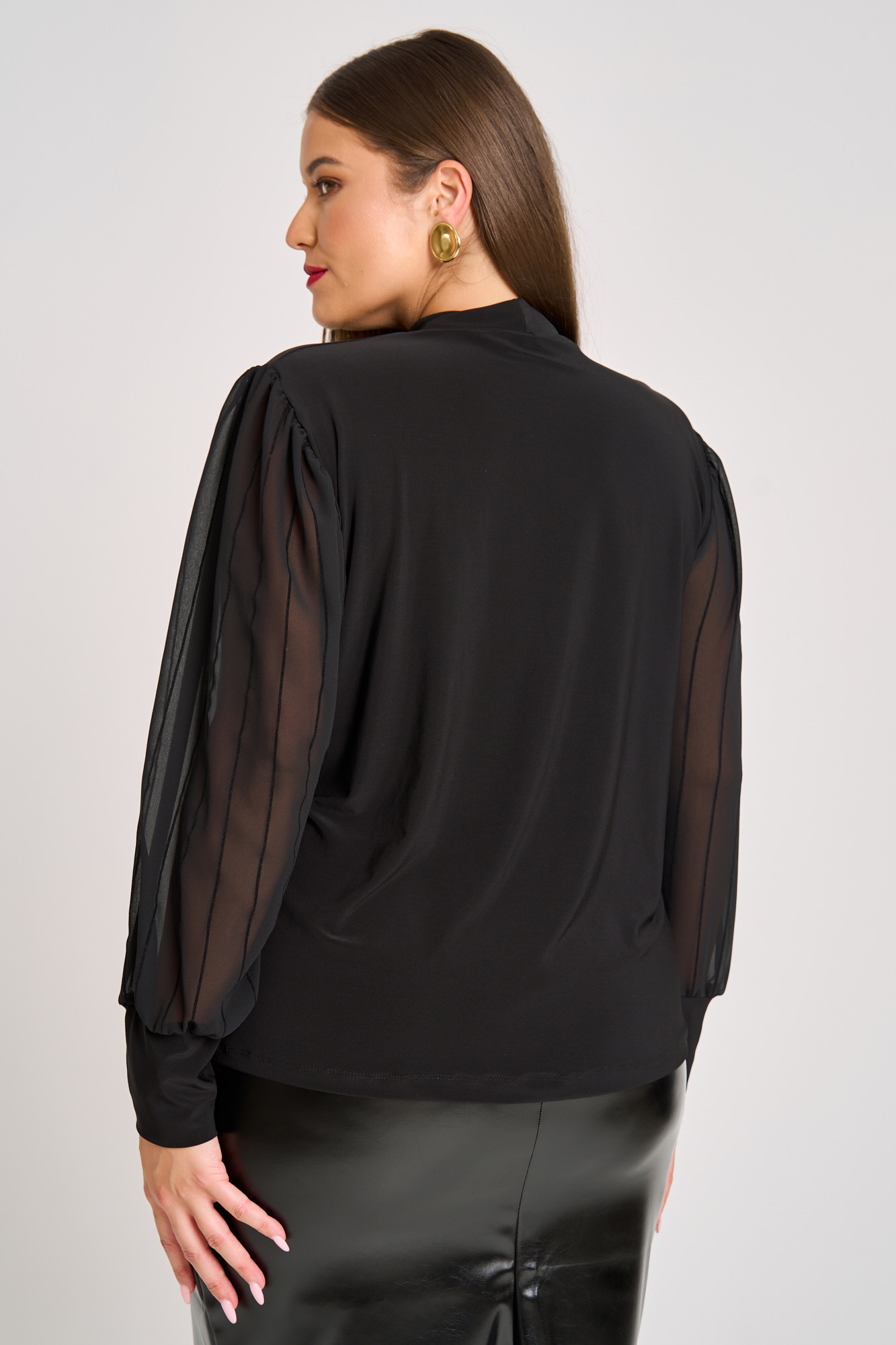 Μπλούζα ελαστική μαύρη. Μακριά σιφόν μανίκια με διακριτική ρίγα και μανσέλα στο τελίωμα. Λαιμόκοψη λουπέτο. Ιδανική για το γραφείο αλλά και βραδινές εμφανίσεις, αυτή η μπλούζα συνδυάζει άνεση και στυλ. Η Ιβάνα έχει ύψος 180εκ, στήθος 114εκ ,μέση 88εκ και περιφέρεια 121εκ και φοράει xl.
