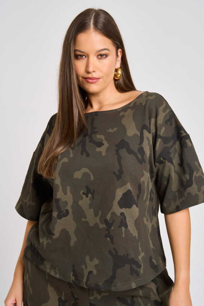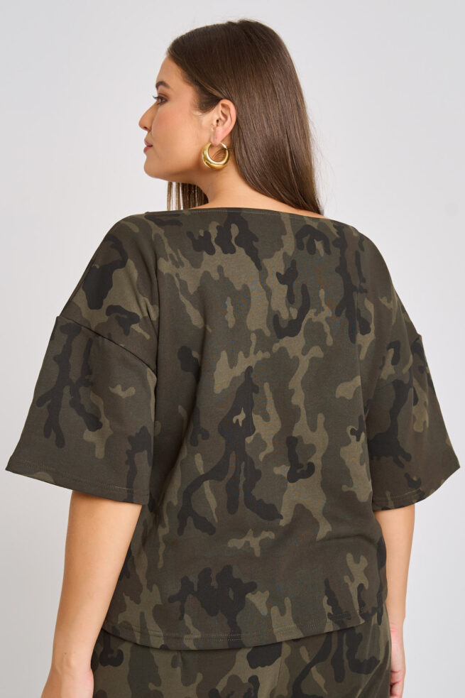 Η απόλυτη επιλογή για άνεση και στυλ! Η μπλούζα παραλλαγής από baby φούτερ ύφασμα της JUCITA προσφέρει μαλακή υφή και υπέροχη εφαρμογή. Διαθέτει χαλαρή γραμμή, μισό μανίκι και στρογγυλή λαιμόκοψη, που μπορεί να φορεθεί και ελαφρώς πέφτοντας στον ώμο για πιο θηλυκό look. Το βαμβακερό ύφασμα χαρίζει άνεση όλη μέρα, ενώ το μοτίβο παραλλαγής δίνει μοντέρνο, urban χαρακτήρα. Συνδύασέ τη με το παντελόνι στο ίδιο ύφασμα για ένα ολοκληρωμένο, stylish σετ που ξεχωρίζει στις casual εμφανίσεις σου! Η Ιβάνα έχει ύψος 180 εκ., μέση 88 εκ. και περιφέρεια 121 εκ., και φοράει μέγεθος XL.
