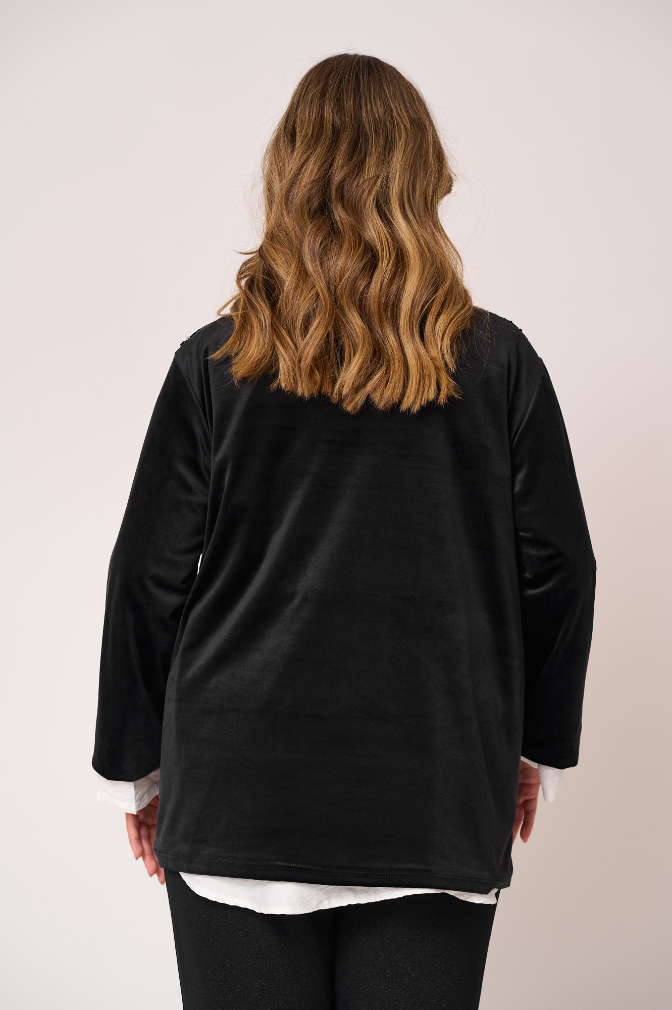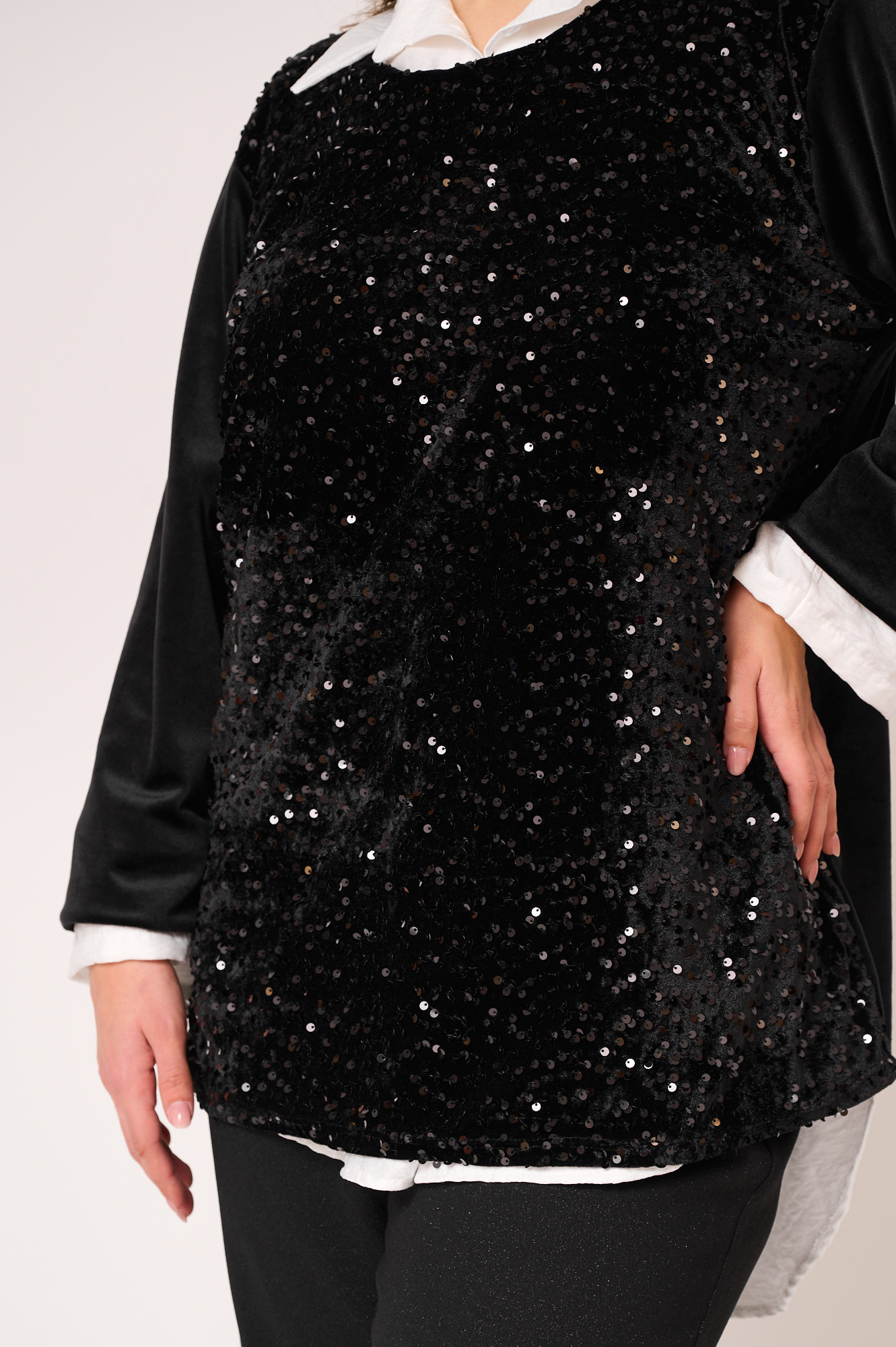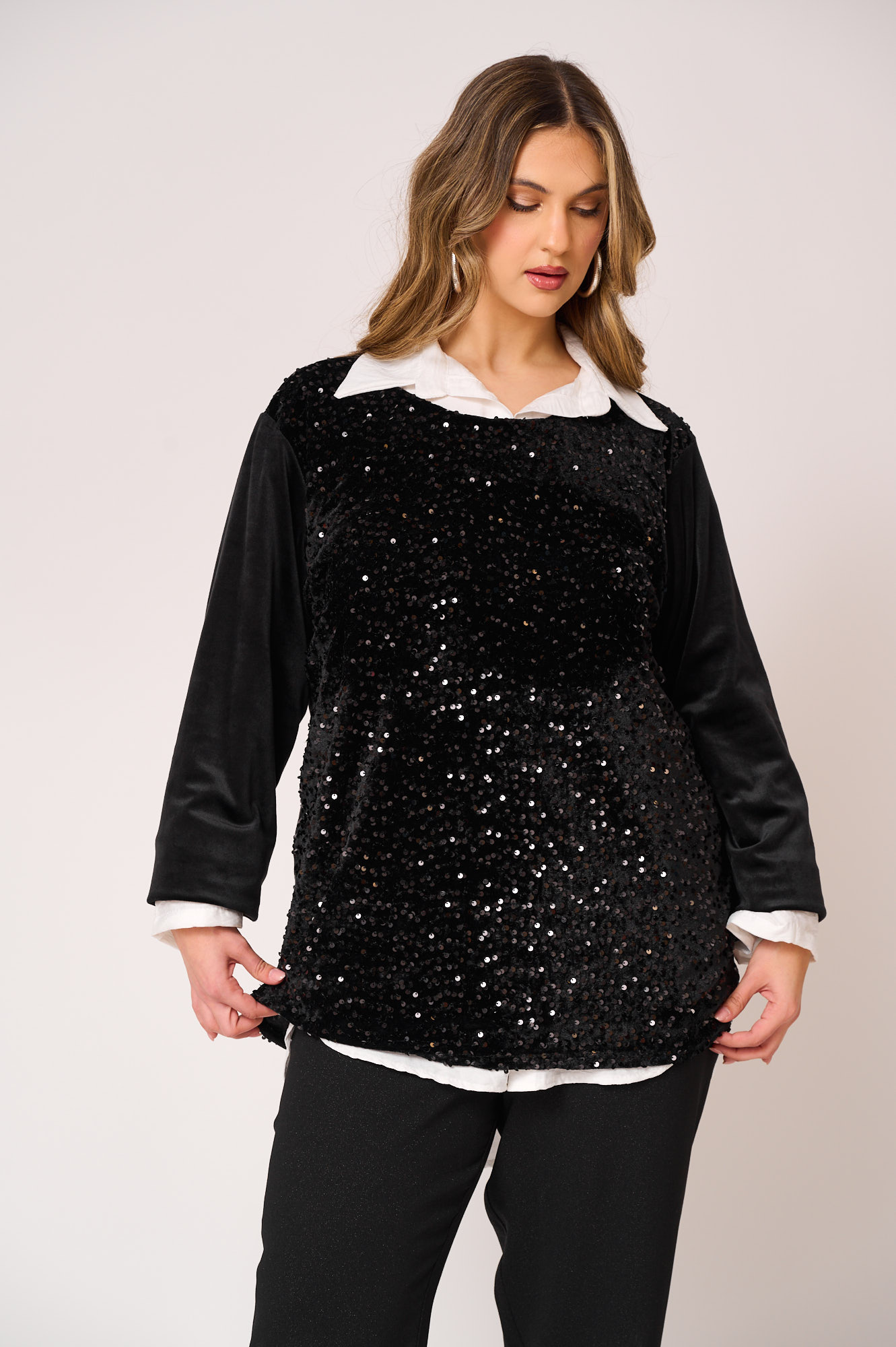 Εντυπωσιακή μπλούζα με παγιέτες στο μπροστινό μέρος, που χαρίζει λάμψη χωρίς υπερβολή και αναβαθμίζει κάθε εμφάνιση. Τα μακριά μανίκια σε μαλακό, ελαστικό ύφασμα προσφέρουν άνεση και ισορροπούν τέλεια με το glamorous στοιχείο των παγιετών. Η ίσια, άνετη γραμμή της αγκαλιάζει το σώμα χωρίς να κολλάει, καθιστώντας τη ιδανική και για plus size σιλουέτες.