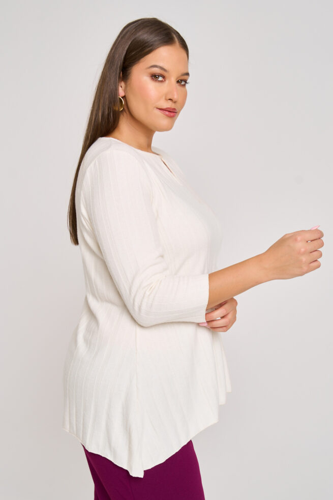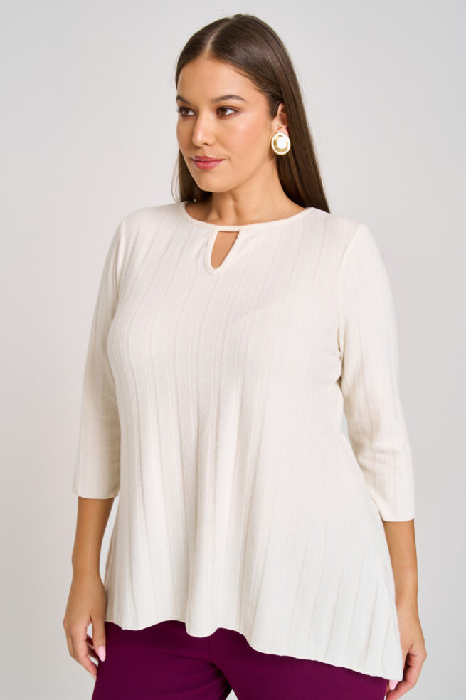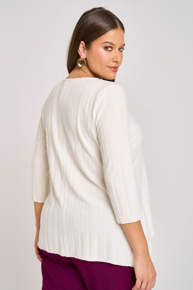 Πλεκτή μπλούζα από ριμπ ύφασμα. Άλφα γραμμή. Στρογγυλή λαιμόκοψη με ιδιαίτερο ντεκολτέ. 3/4 μανίκια. Ξεχωρίστε για το στιλ σας με αυτόν τον κωδικό. Η Ιβάνα έχει ύψος 180εκ, στήθος 114εκ ,μέση 88εκ και περιφέρεια 121εκ και φοράει 2xl.