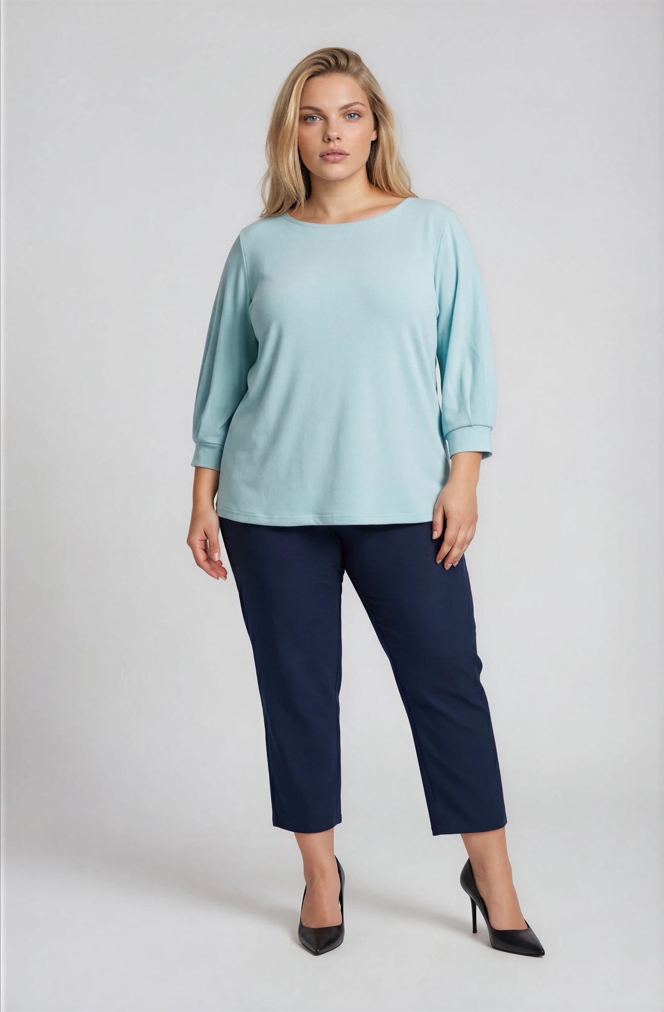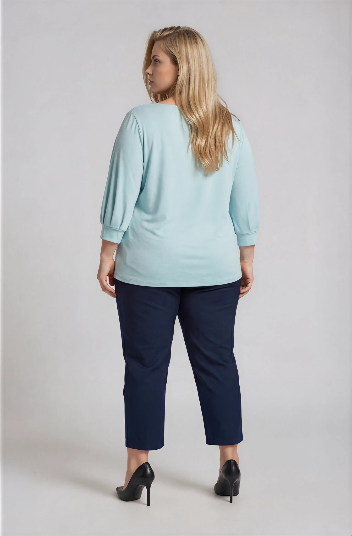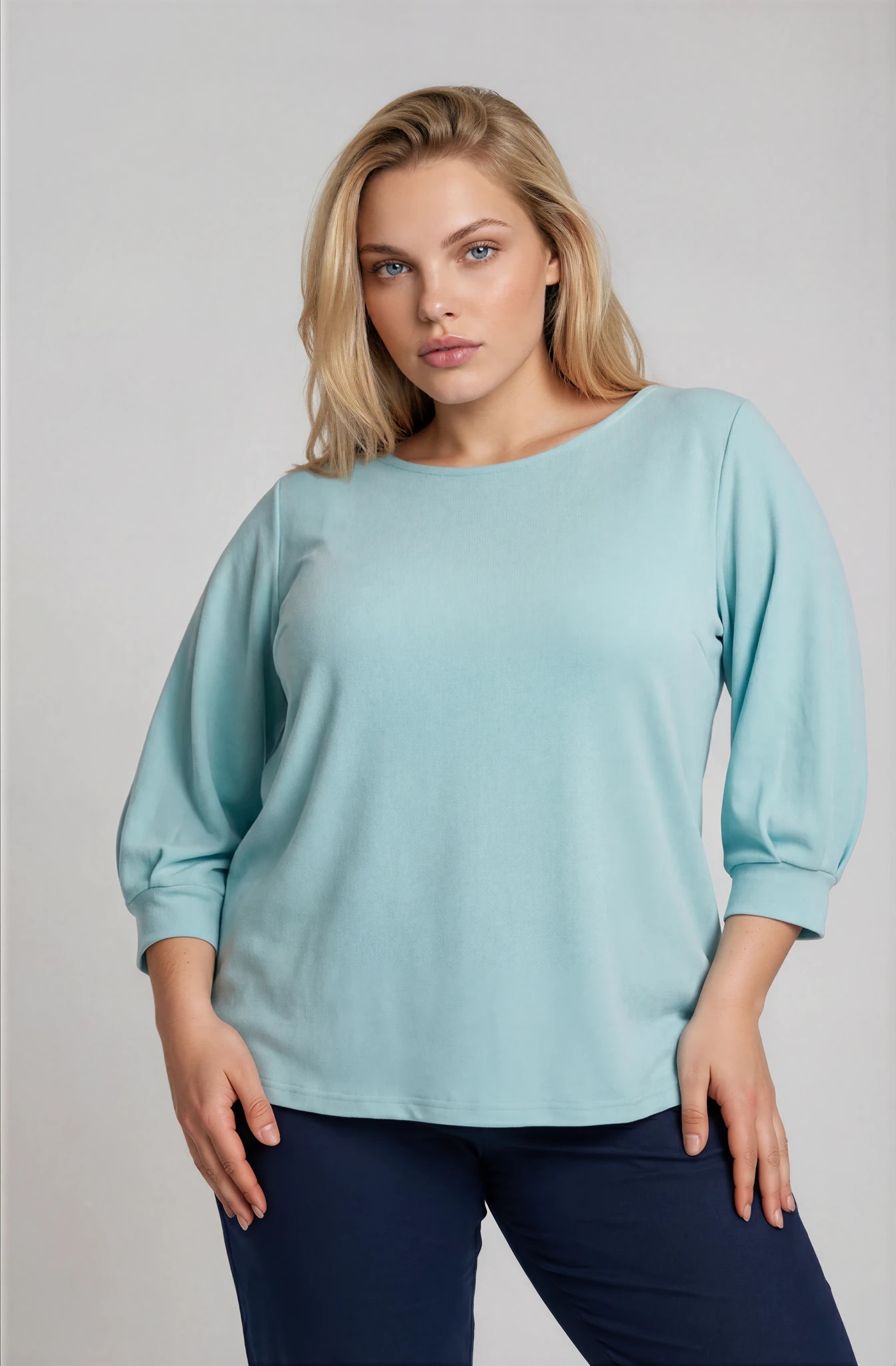 Ελαστική μπλούζα από κρεπ χυτό ύφασμα σε δροσερή απόχρωση μέντας. Διαθέτει στρογγυλή λαιμόκοψη και 3/4 μανίκια με μανσέτα και πιέτες, που προσθέτουν κομψότητα και άνεση στην καθημερινότητα. Συνδυάζεται εύκολα με παντελόνια αλλά και φούστες για σύγχρονα και ευέλικτα looks.