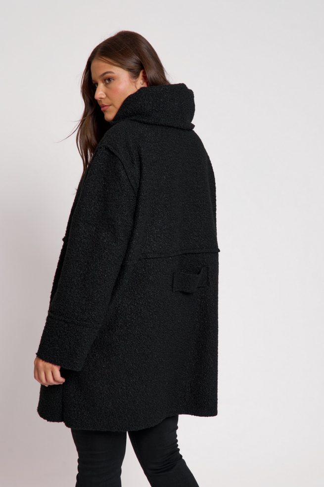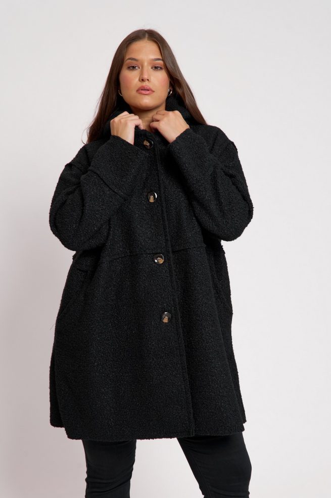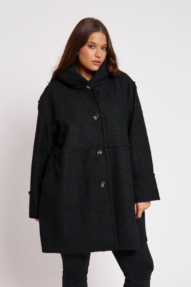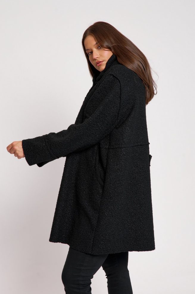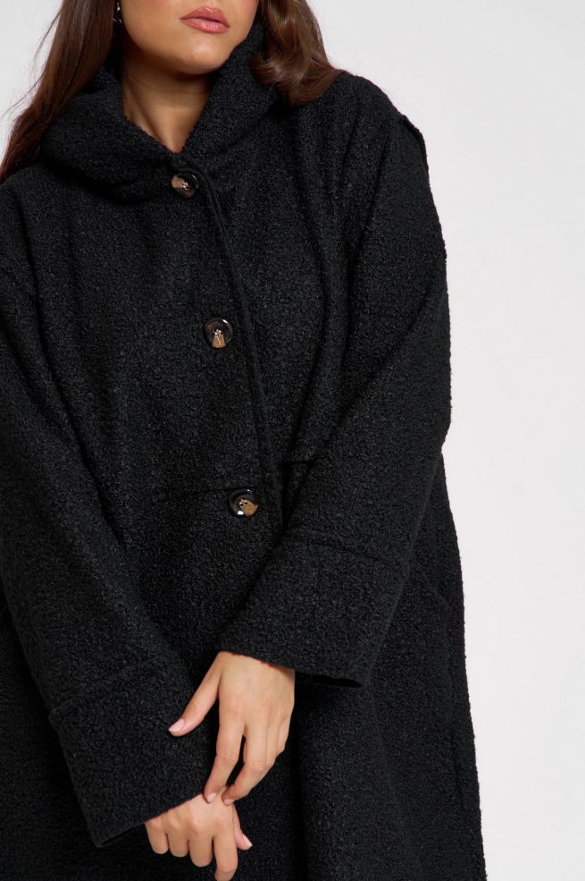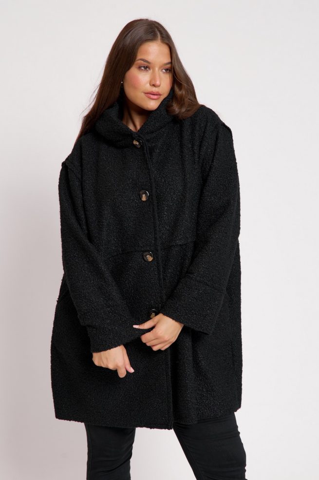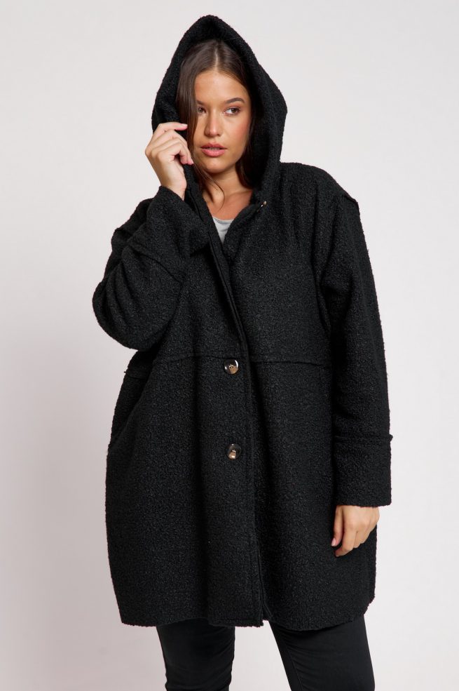 Μπουκλέ παλτοζακέτα σε μαύρο χρώμα με κουκούλα. Σε φαρδιά και άνετη γραμμή. Είναι one size και καλύπτει έως 160εκ. στήθος και 170εκ. περιφέρεια. Κλείνει μπροστά με τέσσερα κουμπιά και έχει πλαϊνές τσέπες. Ένα ζεστό αλλά ελαφρύ πανωφόρι για καθημερινές αλλά και casual βραδινές εμφανίσεις. Η Ιβάνα έχει ύψος 180εκ, στήθος 114εκ ,μέση 88εκ και περιφέρεια 121εκ.
