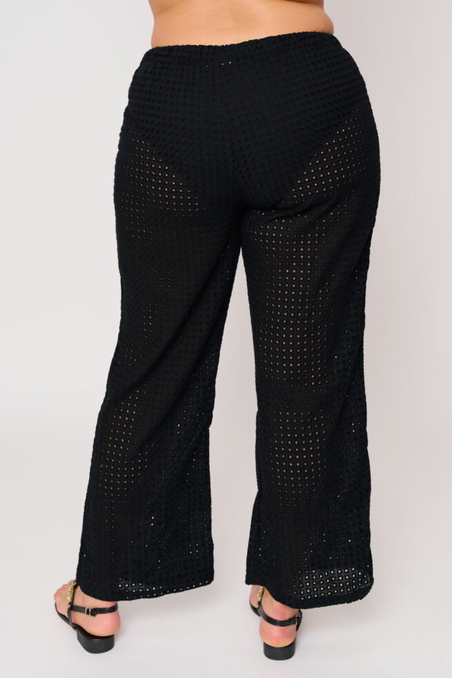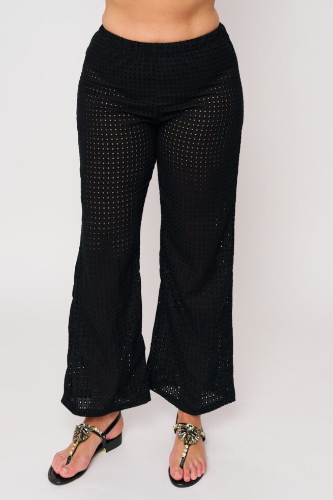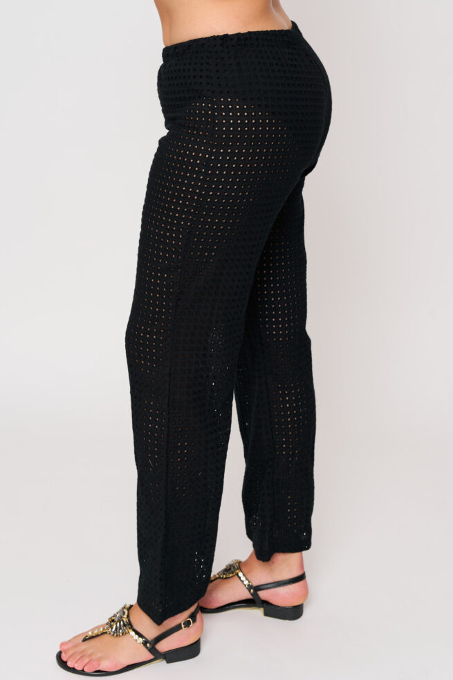 Μακριά παντελόνα με Δαντέλα Κιπούρ σε μαυρό χρώμα. Ψηλόμεση σε άνετη γραμμή με λάστιχο στην μέση για άψογη εφαρμογή. Ιδανική επιλογή για καθημερινές εμφανίσεις και μοντέρνα looks. Συνδυάστε την με το κρουαζέ φόρεμα Dionysia για το απόλυτο co-ord set. Η Ιβάνα έχει ύψος 180εκ, μέση 88εκ και περιφέρεια 121εκ και φοράει το xl.