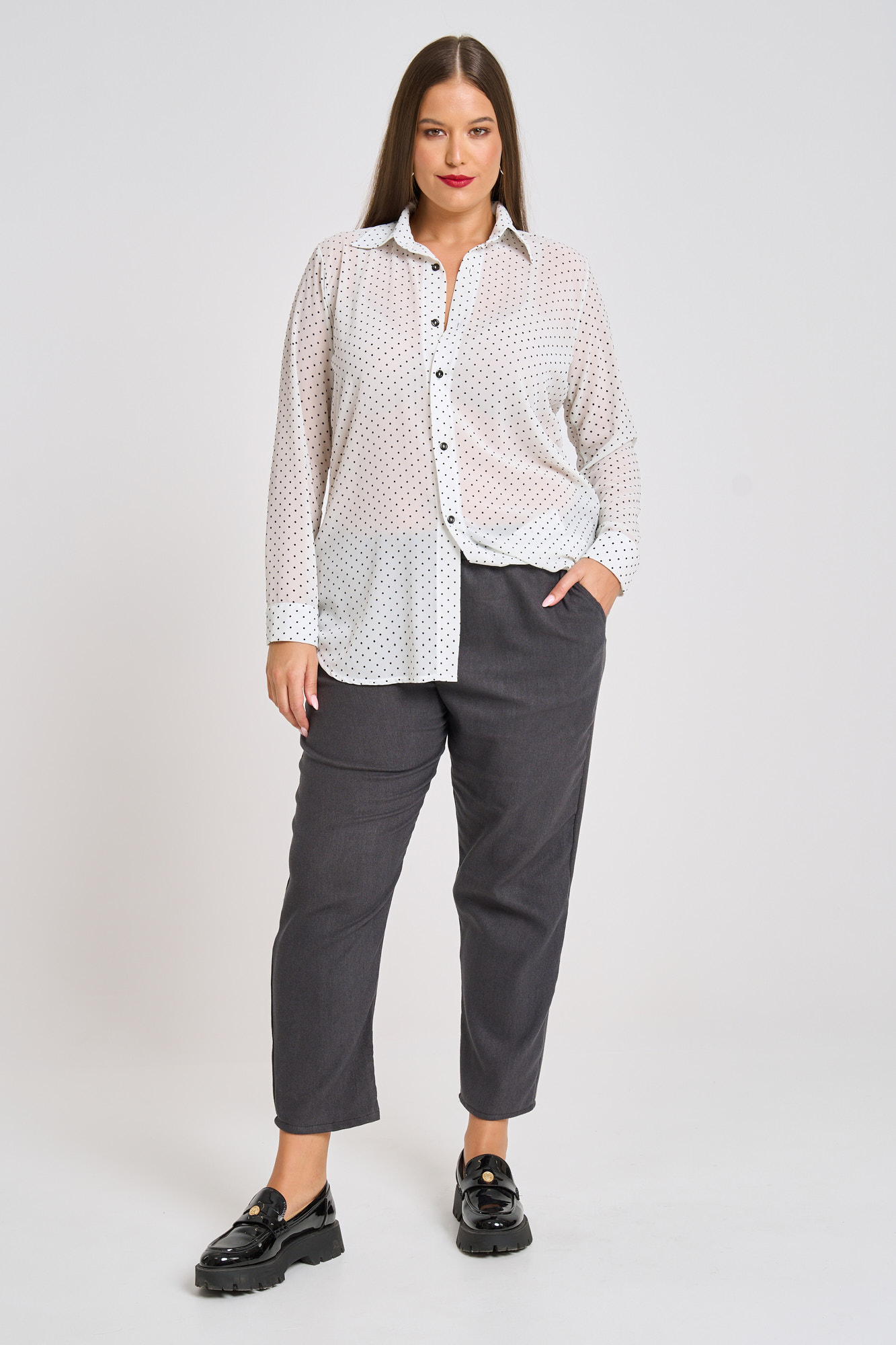 Αναβαθμίστε το καθημερινό σας στυλ με αυτό το κομψό carrot παντελόνι σε γκρο χνούδι ύφασμα, τύπου τσόχα. Η γραμμή του αγκαλιάζει το σώμα, ενώ το λάστιχο στη μέση προσφέρει απόλυτη άνεση και τέλεια εφαρμογή καθ’ όλη τη διάρκεια της ημέρας. Διαθέτει πρακτικές πλαϊνές τσέπες, ιδανικές για extra άνεση και στυλ. Η Ιβάνα έχει ύψος 180 εκ., μέση 88 εκ. και περιφέρεια 121 εκ., και φοράει μέγεθος XL.