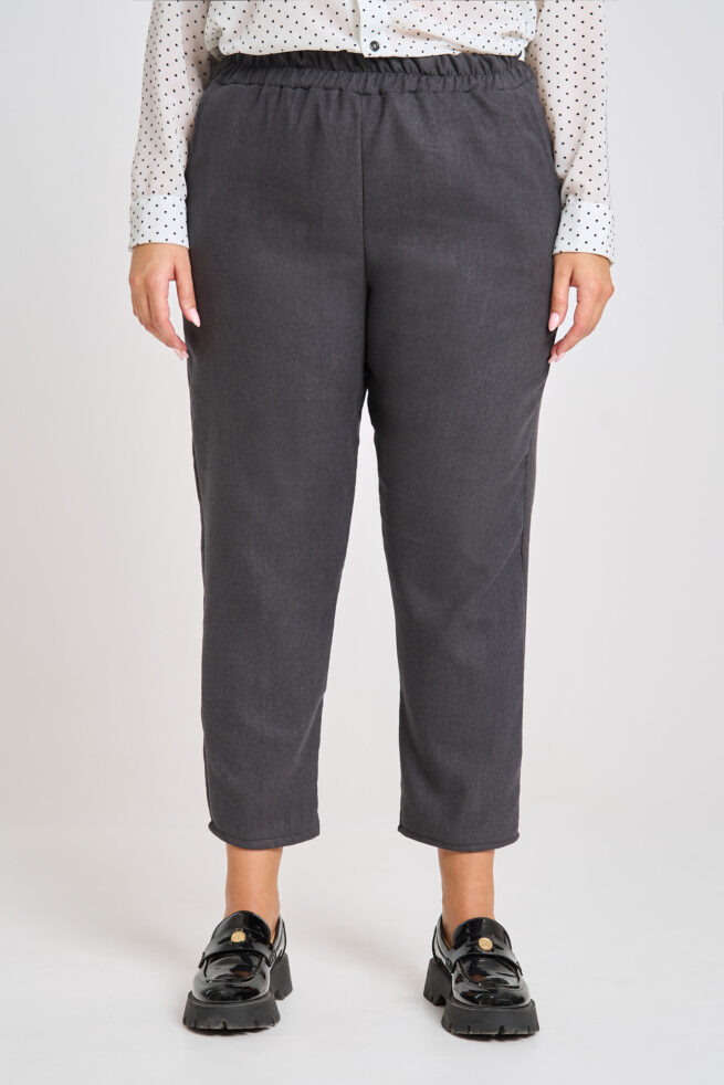Αναβαθμίστε το καθημερινό σας στυλ με αυτό το κομψό carrot παντελόνι σε γκρο χνούδι ύφασμα, τύπου τσόχα. Η γραμμή του αγκαλιάζει το σώμα, ενώ το λάστιχο στη μέση προσφέρει απόλυτη άνεση και τέλεια εφαρμογή καθ’ όλη τη διάρκεια της ημέρας. Διαθέτει πρακτικές πλαϊνές τσέπες, ιδανικές για extra άνεση και στυλ. Η Ιβάνα έχει ύψος 180 εκ., μέση 88 εκ. και περιφέρεια 121 εκ., και φοράει μέγεθος XL.