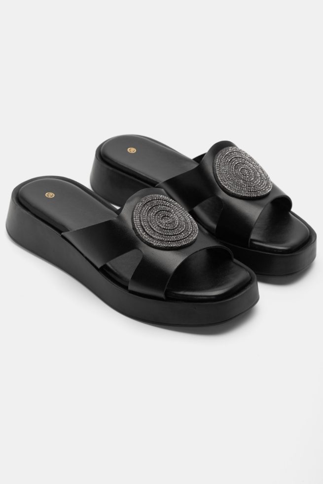 Flatforms με στρογγυλό διακοσμητικό με στρας πέτρες, σόλα στο ίδιο χρώμα και πολύ μαλακό πάτο. Ύψος τακουνιού 2/4εκ.