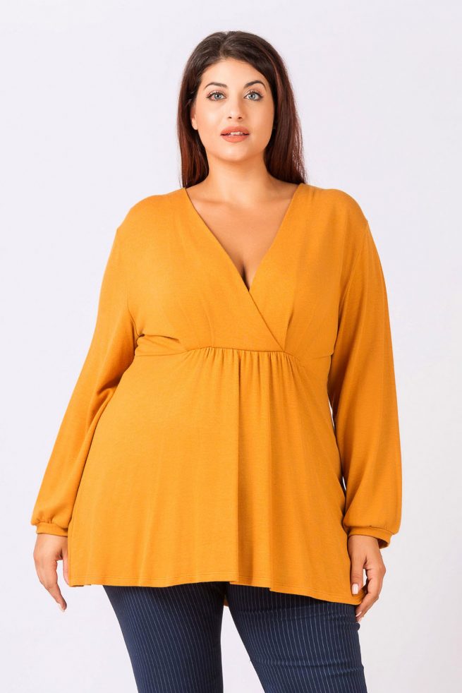 Πλεκτή κρουαζέ μπλούζα από βισκόζη. Μακριά μανίκια με μανσέτα στο τελείωμα και φούσκα μανίκι. Λάστιχο κάτω από το μπούστο που δημιουργεί πιέτες. Σε άλφα γραμμή. Η τέλεια επιλογή για εμφανίσεις με στιλ. Η Στέλλα έχει ύψος 1,71, στήθος 107εκ, μέση 94εκ και περιφέρεια 124εκ και φοράει 2xl.