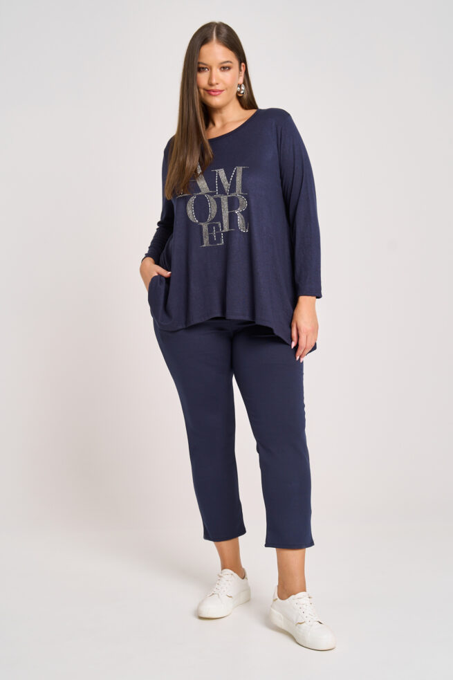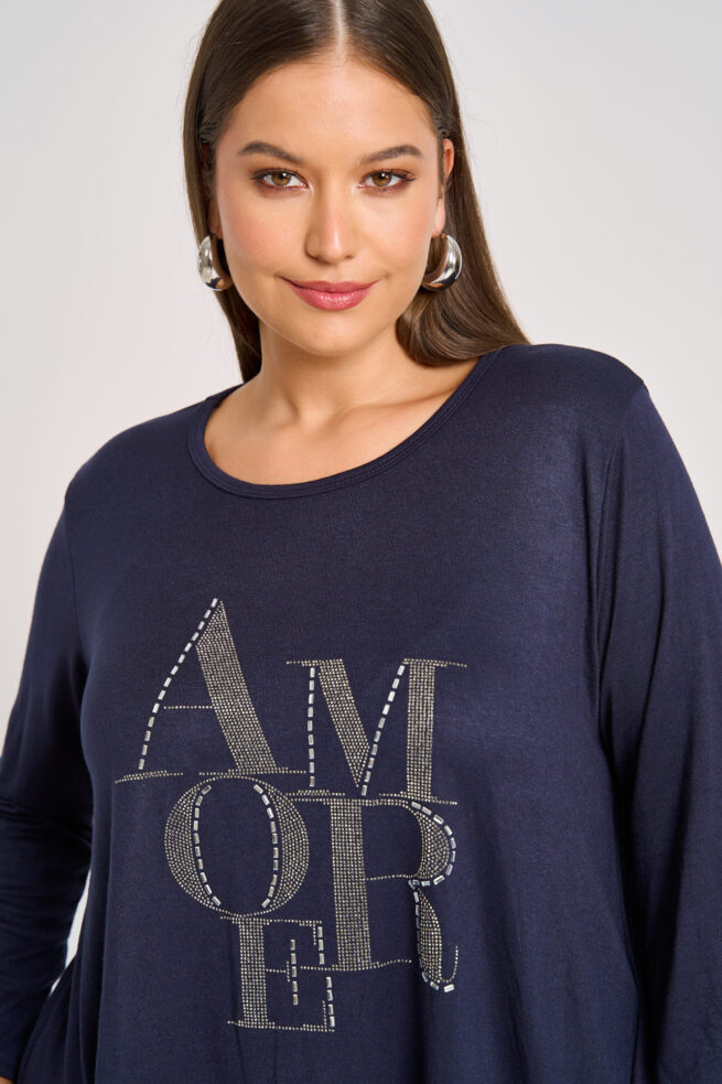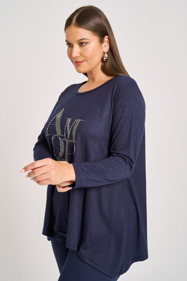 Πλεκτή ελαστική μακριά μπλούζα. Στρόγγυλη λαιμόκοψη. Μακριά μανίκια. Στάμπα με στρας στο μπροστινό μέρος. Πολύ μαλακή και φιλική στο δέρμα. Συνδυάζεται τέλεια με τζιν και κολάν για casual chic εμφανίσεις. Είναι one size και καλύπτει έως 140εκ στήθος και 160εκ περιφέρεια. Μήκος 74/85εκ. Η Ιβάνα έχει ύψος 180εκ, στήθος 114εκ ,μέση 88εκ και περιφέρεια 121εκ και φοράει xl.