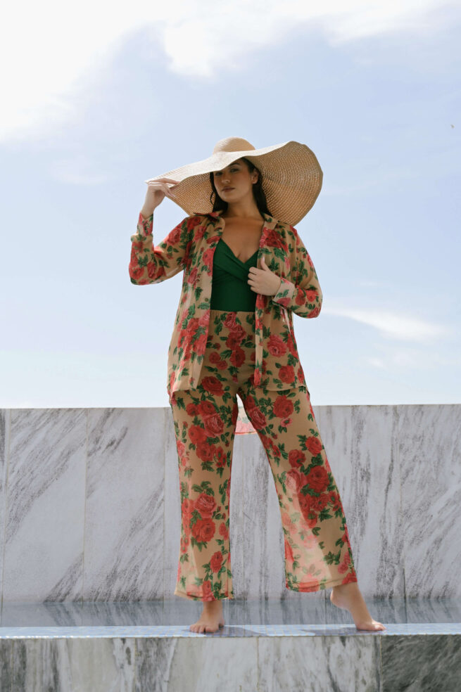 Κομψή φλοραλ πουκαμίσα από σιφόν μουσελίνα. Μπέζ βάση με κόκκινα τριαντάφυλλα, ελαφρώς see-through. Κλασικός γιακάς και κουμπιά κατά μήκος. Μακριά μανίκια με μανσέτα και κουμπί. Ιδανική επιλογή για chic casual ή offices looks. Η Ιβάνα έχει ύψος 180εκ, στήθος 114εκ ,μέση 88εκ και περιφέρεια 121εκ και φοράει xl.