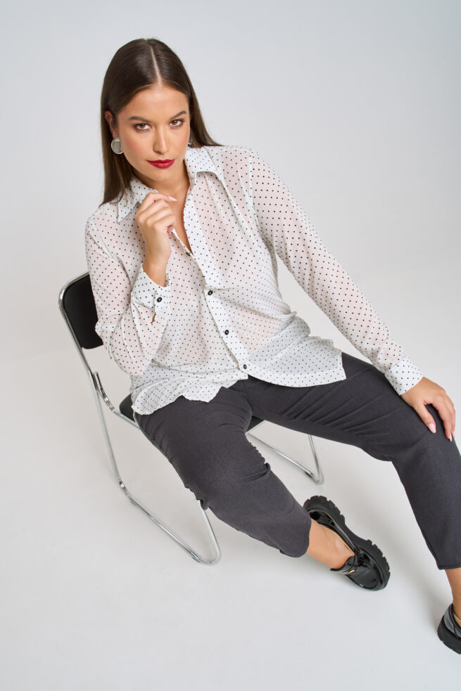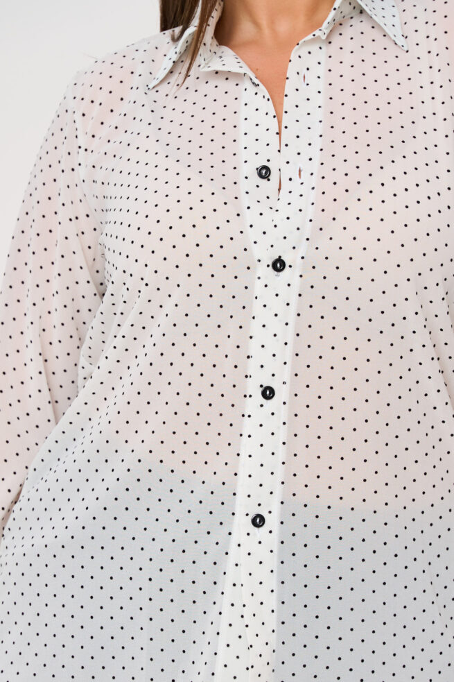 Κομψή ασπρόμαυρη πουκαμίσα με διαχρονικό πουά μοτίβο, ελαφρώς see-through. Λευκή βάση με μαύρα πουά, κλασικός γιακάς και κουμπιά κατά μήκος. Μακριά μανίκια με μανσέτα και κουμπί. Ιδανική επιλογή για chic casual ή offices looks. Η Ιβάνα έχει ύψος 180εκ, στήθος 114εκ ,μέση 88εκ και περιφέρεια 121εκ και φοράει xl.