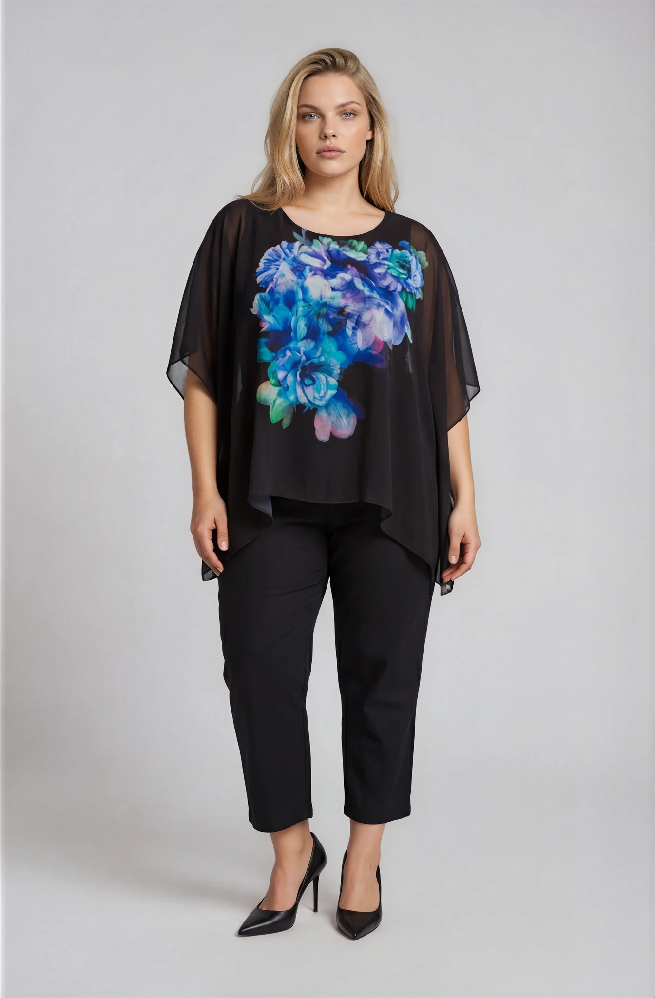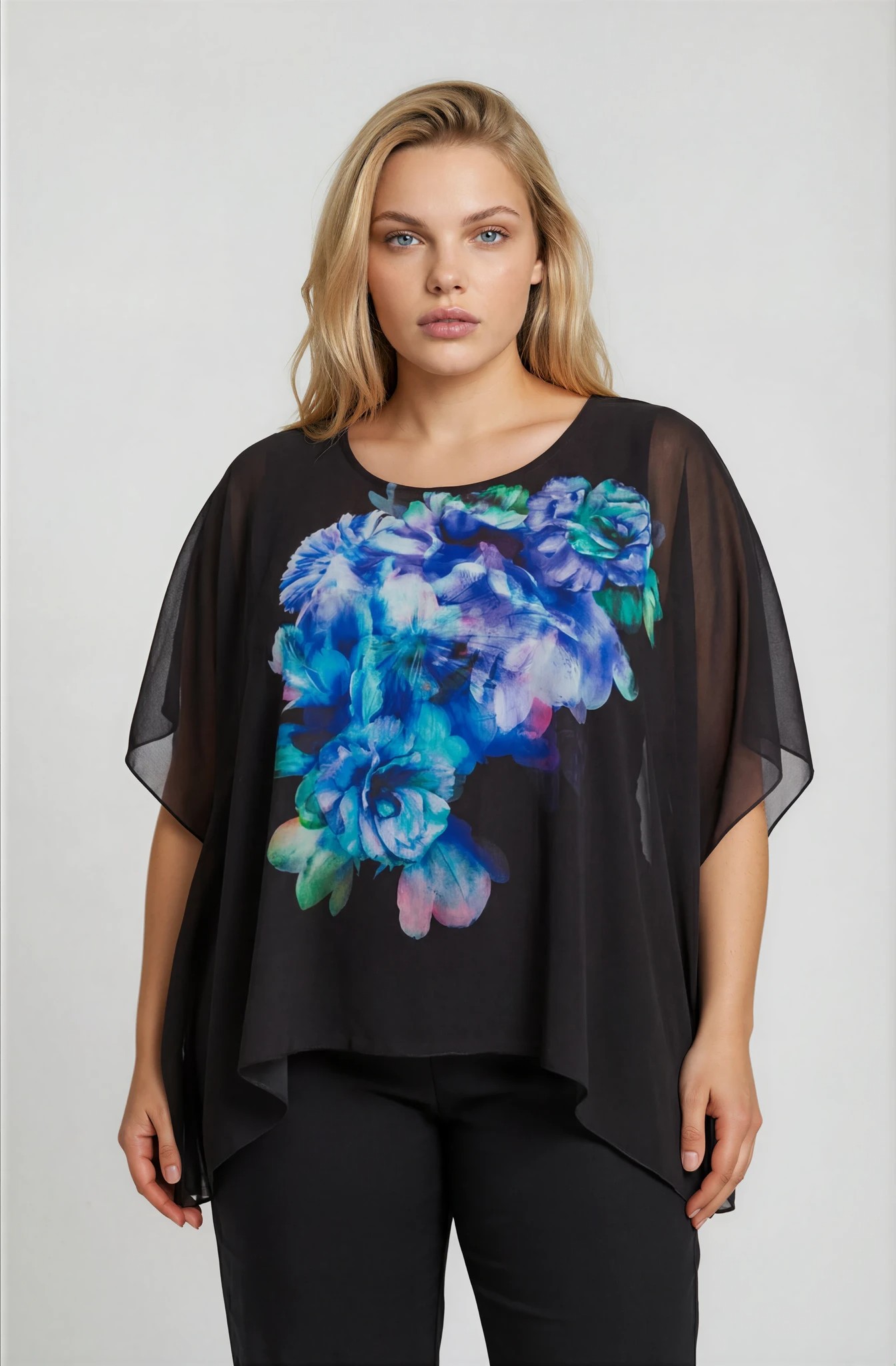 Plus size αέρινη τουνίκ με στρόγγυλη λαιμόκοψη και ζαπονέ μανίκια, ιδανική για επίσημες εμφανίσεις. Το εξωτερικό της μέρος είναι από σιφόν μουσελίνα με εντυπωσιακό floral τύπωμα σε μωβ και μπλε αποχρώσεις, που χαρίζει κομψότητα και κίνηση. Εσωτερικά διαθέτει αμάνικο τοπ από ελαστική βισκόζη για άνετη εφαρμογή και σωστή κάλυψη. Συνδυάζεται ιδανικά με παντελόνα ή pencil φούστα για ένα chic και ολοκληρωμένο look.
