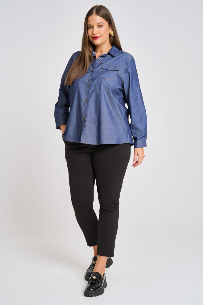 Μακρύ τζιν πουκάμισο. Μακριά μανίκια με δυνατότητα αναδίπλωσης και κουμπί για σταθεροποίηση. Κλείνει με κουμπιά κατά μήκος. Μήκος 75εκ. Η Ιβάνα έχει ύψος 180εκ, στήθος 114εκ ,μέση 88εκ και περιφέρεια 121εκ και φοράει xl.